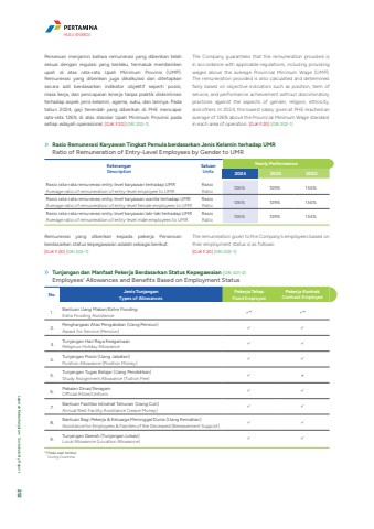 Perseroan menjamin bahwa remunerasi yang diberikan telah sesuai dengan regulasi yang berlaku, termasuk memberikan upah di atas rata-rata Upah Minimum Provinsi (UMP). Remunerasi yang diberikan juga dikalkulasi dan ditetapkan secara adil berdasarkan indikator objektif seperti posisi, masa kerja, dan pencapaian kinerja tanpa praktik diskriminasi terhadap aspek jenis kelamin, agama, suku, dan lainnya. Pada tahun 2024, gaji terendah yang diberikan di PHE mencapai rata-rata 126% di atas standar Upah Minimum Provinsi pada setiap wilayah operasional. [OJK F.20] [GRI 202-1]The Company guarantees that the remuneration provided is in accordance with applicable regulations, including providing wages above the average Provincial Minimum Wage (UMP). The remuneration provided is also calculated and determined fairly based on objective indicators such as position, term of service, and performance achievement without discriminatory practices against the aspects of gender, religion, ethnicity, and others. In 2024, the lowest salary given at PHE reached an average of 126% above the Provincial Minimum Wage standard in each area of operation. [OJK F.20] [GRI 202-1]KeteranganDescriptionSatuanUnitsYearly Performance2024 2023 2022Rasio rata-rata remunerasi entry level karyawan terhadap UMRAverage ratio of remuneration of entry-level employee to UMRRasioRatio 126% 129% 134%Rasio rata-rata remunerasi entry level karyawan wanita terhadap UMRAverage ratio of remuneration of entry-level female employees to UMRRasioRatio 126% 129% 134%Rasio rata-rata remunerasi entry level karyawan laki-laki terhadap UMRAverage ratio of remuneration of entry-level male employees to UMRRasioRatio 126% 129% 134%Rasio Remunerasi Karyawan Tingkat Pemula berdasarkan Jenis Kelamin terhadap UMRRatio of Remuneration of Entry-Level Employees by Gender to UMRNo. Jenis TunjanganTypes of AllowancesPekerja TetapFixed EmployeePekerja KontrakContract Employee1. Bantuan Uang Makan/Extra FoodingExtra Fooding Assistance%uf0fc* %uf0fc*2. Penghargaan Atas Pengabdian (Uang Pensiun)Award for Service (Pension)%uf0fc %uf0fc3. Tunjangan Hari Raya KeagamaanReligious Holiday Allowance%uf0fc %uf0fc4. Tunjangan Posisi (Uang Jabatan)Position Allowance (Position Money)%uf0fc %uf0fc5. Tunjangan Tugas Belajar (Uang Pendidikan)Study Assignment Allowance (Tuition Fee)%uf0fc %uf0fb6. Pakaian Dinas/SeragamOfficial Attire/Uniform%uf0fc %uf0fc7. Bantuan Fasilitas Istirahat Tahunan (Uang Cuti)Annual Rest Facility Assistance (Leave Money)%uf0fc %uf0fc8. Bantuan Bagi Pekerja & Keluarga Meninggal Dunia (Uang Kematian)Assistance for Employees & Families of the Deceased (Bereavement Support)%uf0fc %uf0fc9. Tunjangan Daerah (Tunjangan Lokasi)Local Allowance (Location Allowance)%uf0fc %uf0fcRemunerasi yang diberikan kepada pekerja Perseroan berdasarkan status kepegawaian adalah sebagai berikut: [OJK F.20] [GRI 202-1]The remuneration given to the Company%u2019s employees based on their employment status is as follows:[OJK F.20] [GRI 202-1]*)Pada saat lembur.During Overtime.Tunjangan dan Manfaat Pekerja Berdasarkan Status Kepegawaian [GRI 401-2]Employees' Allowances and Benefits Based on Employment StatusHULU ENERGILaporan Keberlanjutan %u2022 Sustainability Report 252
