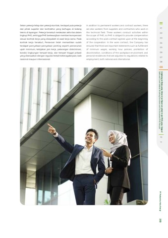 Selain pekerja tetap dan pekerja kontrak, terdapat pula pekerja dari pihak supplier dan kontraktor yang bertugas di bidang teknis di lapangan. Pekerja tersebut melakukan aktivitas dalam lingkup PHE, sehingga PHE berkewajiban memberi kompensasi sesuai kontrak kerja yang disepakati di awal kerja sama. Pada kontrak kerja tersebut, Perseroan telah memastikan sudah terdapat pernyataan-pernyataan penting seperti pemenuhan upah minimum, kebijakan jam kerja, pelarangan diskriminasi, kondisi lingkungan tempat kerja, dan tempat tinggal pribadi yang disesuaikan dengan regulasi terkait ketenagakerjaan, baik nasional maupun internasional.In addition to permanent workers and contract workers, there are also workers from suppliers and contractors who work in the technical field. These workers conduct activities within the scope of PHE, so PHE is obliged to provide compensation according to the work contract agreed upon at the beginning of the cooperation. In the work contract, the Company has ensured that there are important statements such as fulfillment of minimum wages, working hour policies, prohibition of discrimination, conditions of the workplace environment, and personal residences that are adjusted to regulations related to employment, both national and international.010203040506070809 Safe and Comfortable Working Environment For Excellent PHE People Lingkungan Kerja yang Aman dan Nyaman untuk Insan PHE yang Unggul1011 PT Pertamina Hulu Energi 253