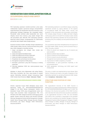 KESEHATAN DAN KESELAMATAN KERJAOCCUPATIONAL HEALTH AND SAFETY [OJK F.21] [GRI 3-3, 403]PHE Subholding Upstream memiliki komitmen untuk selalu melaksanakan kegiatan operasional dengan memperhatikan aspek Kesehatan dan Keselamatan Kerja (K3), keamanan, serta perlindungan terhadap lingkungan dan masyarakat sekitar. Perusahaan selalu berfokus pada keselamatan dan asset integrity secara terus menerus, yang sejalan dengan tata nilai perusahaan yaitu AKHLAK. PHE Subholding Upstream berprinsip bahwa dengan mengedepankan K3, keberhasilan perusahaan akan didapat dalam jangka panjang.Komitmen tersebut semakin dikuatkan dengan diterbitkannya HSSE (Health, Safety, Security, and Environment) Policy pada tahun 2024. Kebijakan ini berisikan tentang:1. Upaya pencegahan dan mitigasi risiko insiden dan kecelakaan kerja 2. Upaya pencegahan kecelakaan besar 3. Upaya pencegahan pencemaran lingkungan4. Upaya pencegahan gangguan keamanan5. Pengelolaan dan pemantauan kondisi pekerja6. Peningkatan kompetensi HSSE pekerja7. Penerapan governance yang baik khususnya di bidang lingkungan8. Teknologi digitalisasi HSSE dan sarana-prasarana kerja aspek HSSEKebijakan ini dibuat untuk dilaksanakan oleh setiap Pekerja, Mitra Kerja, Kontraktor dan Tamu yang berada di wilayah operasi Subholding Upstream dengan menjunjung tinggi HSSE Golden Rules Pertamina: Patuh - Intervensi - Peduli. STRUKTUR DAN KEDUDUKAN FUNGSI HSSE Struktur organisasi Fungsi HSSE ditetapkan sesuai Surat Keputusan Direksi No. KPTS.052/PHE00000/2022-S0 tanggal 15 Juli 2022. Berikut disampaikan struktur dan kedudukan Fungsi HSSE yang menggambarkan peran dan fungsi serta koordinasi dalam keorganisasian PHE. Vice President (VP) HSSE sebagai koordinator bertanggung jawab kepada Direktur Utama dan dibantu oleh Assistant Manager Planning, Management System & Risk Management; Manager Health; Senior Manager Safety; Manager Security; Manager Environment; dan Senior Manager HSSE Performance, Assurance & ERCM.PHE Subholding Upstream is committed to always conducting operational activities by paying attention to the aspects of Occupational Health and Safety (OHS), security, and protection of the environment and surrounding communities. The company always focuses on safety and asset integrity continuously, which is in line with the company%u2019s values, namely AKHLAK. PHE Subholding Upstream has the principle that by prioritizing OHS, the company%u2019s success will be achieved in the long term.This commitment was further strengthened by the issuance of the HSSE (Health, Safety, Security, and Environment) Policy in 2024. This policy contains:1. Efforts to prevent and mitigate the risk of incidents and work accidents2. Efforts to prevent major accidents3. Efforts to prevent environmental pollution 4. Efforts to prevent security disturbance 5. Management and monitoring of workers%u2019 conditions6. Improvement of HSSE competency of workers7. Implementation of good governance especially in the environmental sector8. HSSE digitalization technology and HSSE aspect work infrastructureThis policy is made to be implemented by every Worker, Work Partner, Contractor and Guest in the areas of operation of the Subholding Upstream by upholding Pertamina%u2019s HSSE Golden Rules: Compliance - Intervention - Care.STRUCTURE AND POSITION OF HSSE FUNCTIONThe organizational structure of the HSSE Function is determined in accordance with Resolution of Board of Directors No. KPTS.052/PHE00000/2022-S0 dated July 15, 2022. The following is the structure and position of the HSSE Function which describes the roles and functions as well as coordination in the organizational structure of PHE. The Vice President (VP) HSSE as the coordinator is responsible to the President Director and is assisted by the Assistant Manager of Planning, Management System & Risk Management; Manager of Health; Senior Manager of Safety; Manager of Security; Manager of Environment; and Senior Manager of HSSE Performance, Assurance & ERCM.HULU ENERGILaporan Keberlanjutan %u2022 Sustainability Report 254