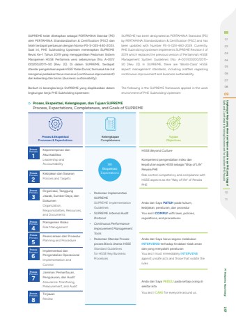 SUPREME telah ditetapkan sebagai PERTAMINA Standar (PS) oleh PERTAMINA Standardization & Certification (PSC) dan telah terdapat perbaruan dengan Nomor PS-S-023-440-2023. Saat ini, PHE Subholding Upstream menerapkan SUPREME Revisi Ke-1 Tahun 2019 yang menggantikan Pedoman Sistem Manajemen HSSE Pertamina versi sebelumnya (No. A-001/I00200/2011%u2013S0 [Rev. 2]). Di dalam SUPREME, terdapat standar pengelolaan aspek HSSE %u2018Kelas Dunia%u2019, termasuk hal-hal mengenai perbaikan terus menerus (continuous improvement) dan keberlanjutan bisnis (business sustainability).Berikut ini kerangka kerja SUPREME yang diaplikasikan dalam lingkungan kerja PHE Subholding Upstream: SUPREME has been designated as PERTAMINA Standard (PS) by PERTAMINA Standardization & Certification (PSC) and has been updated with Number PS-S-023-440-2023. Currently, PHE Subholding Upstream implements SUPREME Revision 1 of 2019 which replaces the previous version of Pertamina%u2019s HSSE Management System Guidelines (No. A-001/I00200/2011%u2013S0 [Rev. 2]). In SUPREME, there are %u2018World-Class%u2019 HSSE aspect management standards, including matters regarding continuous improvement and business sustainability.The following is the SUPREME framework applied in the work environment of PHE Subholding Upstream:Proses & EkspektasiProcesses & ExpectationsKelengkapanCompletenessTujuanObjectivesProsesProcess1Kepemimpinan dan AkuntabilitasLeadership and Accountability%u2022 Pedoman Implementasi SUPREMESUPREME Implementation Guidelines%u2022 SUPREME Internal Audit Protocol%u2022 Continuous PerformanceImprovement Management Tools%u2022 Pedoman Standar Prosesproses Bisnis Utama HSSEStandard Guidelines for HSSE Key Business ProcessesHSSE Beyond CultureKompetensi pengendalian risiko dan kepatuhan aspek HSSE sebagai %u201cWay of Life%u201d Perwira PHERisk control competency and compliance with HSSE aspects as the %u201cWay of life%u201d of Perwira PHEProsesProcess2Kebijakan dan SasaranPolicies and TargetsProsesProcess3Organisasi, Tanggung Jawab, Sumber Daya, dan DokumenOrganization, Responsibilities, Resources, and DocumentsAnda dan Saya PATUH pada hukum, keb%u0133akan, peraturan, dan prosedurYou and I COMPLY with laws, policies, regulations, and proceduresProsesProcess4Manajemen RisikoRisk ManagementProsesProcess5Perencanaan dan ProsedurPlanning and Procedure Anda dan Saya harus segera melakukan INTERVENSI terhadap tindakan tidak aman dan yang menyalahi peraturanYou and I must immediately INTERVENE against unsafe acts and those that violate the rulesProsesProcess6Implementasi dan Pengendalian OperasionalImplementation and ControlProsesProcess7Jaminan: Pemantauan, Pengukuran, dan AuditAssurance: Monitoring, Measurement, and AuditAnda dan Saya PEDULI pada setiap orang di sekitar kitaYou and I CARE for everyone around us. ProsesProcess8TinjauanReview191EkspektasiExpectationsProses, Ekspektasi, Kelengkapan, dan Tujuan SUPREMEProcess, Expectations, Completeness, and Goals of SUPREME 010203040506070809 Safe and Comfortable Working Environment For Excellent PHE People Lingkungan Kerja yang Aman dan Nyaman untuk Insan PHE yang Unggul1011 PT Pertamina Hulu Energi 257