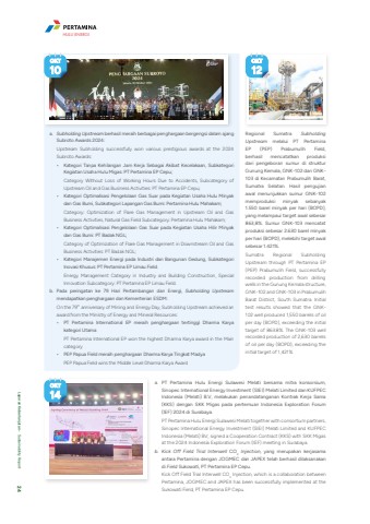 OKT10OKT12a. Subholding Upstream berhasil meraih berbagai penghargaan bergengsi dalam ajang Subroto Awards 2024:Upstream Subholding successfully won various prestigious awards at the 2024 Subroto Awards:%u2022 Kategori Tanpa Kehilangan Jam Kerja Sebagai Akibat Kecelakaan, Subkategori Kegiatan Usaha Hulu Migas: PT Pertamina EP Cepu;Category Without Loss of Working Hours Due to Accidents, Subcategory of Upstream Oil and Gas Business Activities: PT Pertamina EP Cepu;%u2022 Kategori Optimalisasi Pengelolaan Gas Suar pada Kegiatan Usaha Hulu Minyak dan Gas Bumi, Subkategori Lapangan Gas Bumi: Pertamina Hulu Mahakam;Category: Optimization of Flare Gas Management in Upstream Oil and Gas Business Activities, Natural Gas Field Subcategory: Pertamina Hulu Mahakam;%u2022 Kategori Optimalisasi Pengelolaan Gas Suar pada Kegiatan Usaha Hilir Minyak dan Gas Bumi: PT Badak NGL;Category of Optimization of Flare Gas Management in Downstream Oil and Gas Business Activities: PT Badak NGL;%u2022 Kategori Manajemen Energi pada Industri dan Bangunan Gedung, Subkategori Inovasi Khusus: PT Pertamina EP Limau Field.Energy Management Category in Industry and Building Construction, Special Innovation Subcategory: PT Pertamina EP Limau Field.b. Pada peringatan ke 79 Hari Pertambangan dan Energi, Subholding Upstreammendapatkan penghargaan dan Kementerian ESDM:On the 79th anniversary of Mining and Energy Day, Subholding Upstream achieved an award from the Ministry of Energy and Mineral Resources:%u2022 PT Pertamina International EP meraih penghargaan tertinggi Dharma Karya kategori UtamaPT Pertamina International EP won the highest Dharma Karya award in the Main category%u2022 PEP Papua Field meraih penghargaan Dharma Karya Tingkat MadyaPEP Papua Field wins the Middle Level Dharma Karya AwardRegional Sumatra Subholding Upstream melalui PT Pertamina EP (PEP) Prabumulih Field, berhasil mencatatkan produksi dari pengeboran sumur di struktur Gunung Kemala, GNK-102 dan GNK103 di Kecamatan Prabumulih Barat, Sumatra Selatan. Hasil pengujian awal menunjukkan sumur GNK-102 memproduksi minyak sebanyak 1.550 barel minyak per hari (BOPD), yang melampaui target awal sebesar 863,8%. Sumur GNK-103 mencatat produksi sebesar 2.630 barel minyak per hari (BOPD), melebihi target awal sebesar 1.421%.Sumatra Regional Subholding Upstream through PT Pertamina EP (PEP) Prabumulih Field, successfully recorded production from drilling wells in the Gunung Kemala structure, GNK-102 and GNK-103 in Prabumulih Barat District, South Sumatra. Initial test results showed that the GNK102 well produced 1,550 barrels of oil per day (BOPD), exceeding the initial target of 863.8%. The GNK-103 well recorded production of 2,630 barrels of oil per day (BOPD), exceeding the initial target of 1,421%.a. PT Pertamina Hulu Energi Sulawesi Melati bersama mitra konsorsium, Sinopec International Energy Investment (SIEI) Melati Limited dan KUFPEC Indonesia (Melati) B.V, melakukan penandatanganan Kontrak Kerja Sama (KKS) dengan SKK Migas pada pertemuan Indonesia Exploration Forum (IEF) 2024 di Surabaya.PT Pertamina Hulu Energi Sulawesi Melati together with consortium partners, Sinopec International Energy Investment (SIEI) Melati Limited and KUFPEC Indonesia (Melati) BV, signed a Cooperation Contract (KKS) with SKK Migas at the 2024 Indonesia Exploration Forum (IEF) meeting in Surabaya.b. Kick Off Field Trial Interwell CO2 Injection, yang merupakan kerjasama antara Pertamina dengan JOGMEC dan JAPEX telah berhasil dilaksanakan di Field Sukowati, PT Pertamina EP Cepu.Kick Off Field Trial Interwell CO2 Injection, which is a collaboration between Pertamina, JOGMEC and JAPEX has been successfully implemented at the Sukowati Field, PT Pertamina EP Cepu.OKT14HULU ENERGILaporan Keberlanjutan %u2022 Sustainability Report 24