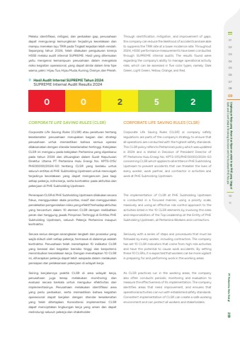 Melalui identifikasi, mitigasi, dan perbaikan gap, perusahaan dapat mengurangi kemungkinan terjadinya kecelakaan dan mampu menekan laju TRIR pada Tingkat kejadian lebih rendah. Sepanjang tahun 2024, telah dilakukan pengukuran kinerja HSSE melalui audit internal SUPREME. Hasil yang ditemukan yaitu mengenai kemampuan perusahaan dalam mengelola risiko kegiatan operasional, yang dapat dinilai dalam lima tipe warna, yakni: Hijau Tua, Hijau Muda, Kuning, Oranye, dan Merah.Through identification, mitigation, and improvement of gaps, the company can reduce the likelihood of accidents and are able to suppress the TRIR rate at a lower incidence rate. Throughout 2024, HSSE performance measurements have been conducted through SUPREME internal audits. The results found were regarding the company%u2019s ability to manage operational activity risks, which can be assessed in five color types, namely: Dark Green, Light Green, Yellow, Orange, and Red.0 0 2 5 2CORPORATE LIFE SAVING RULES (CLSR)Corporate Life Saving Rules (CLSR) atau peraturan tentang keselamatan perusahaan merupakan bagian dari strategi perusahaan untuk memastikan bahwa semua operasi dilaksanakan dengan standar keselamatan tertinggi. Kebijakan CLSR ini mengacu pada kebijakan Pertamina yang diperbarui pada tahun 2024 dan dituangkan dalam Surat Keputusan Direktur Utama PT Pertamina Hulu Energi No. KPTS-015/PHE00000/2024-S0 tentang CLSR yang berlaku untuk seluruh entitas di PHE Subholding Upstream untuk mencegah terjadinya kecelakaan yang dapat mengancam jiwa bagi setiap pekerja, mitra kerja, serta kontraktor pada aktivitas dan pekerjaan di PHE Subholding Upstream. Penerapan CLSR di PHE Subholding Upstream dilakukan secara fokus, menggunakan skala prioritas, masif dan menggunakan pendekatan pengendalian risiko yang efektif terhadap aktivitas yang tercantum dalam 10 elemen CLSR dengan melibatkan peran dan tanggung jawab Pimpinan Tertinggi di Entitas PHE Subholding Upstream, seluruh Pekerja Pertamina maupun kontraktor.Secara serius dengan serangkaian langkah dan prosedur yang wajib diikuti oleh setiap pekerja, termasuk di dalamnya adalah kontraktor. Perusahaan telah menetapkan 10 indikator CLSR yang berasal dari kegiatan berisiko tinggi dan berpotensi menimbulkan kecelakaan kerja. Dengan menetapkan 10 CLSR ini, diharapkan pekerja dapat lebih waspada dalam melakukan persiapan dan pelaksanaan pekerjaan di wilayah kerja.Seiring berjalannya praktik CLSR di area wilayah kerja, perusahaan juga kerap melakukan monitoring dan evaluasi secara berkala untuk mengukur efektivitas dari implementasinya. Perusahaan melakukan identifikasi area yang perlu perbaikan, serta memastikan bahwa kegiatan operasional dapat berjalan dengan standar keselamatan yang telah ditetapkan. Konsistensi implementasi CLSR dapat menciptakan lingkungan kerja yang aman dan dapat melindungi seluruh pekerja dan stakeholder.CORPORATE LIFE SAVING RULES (CLSR)Corporate Life Saving Rules (CLSR) or company safety regulations are parts of the company%u2019s strategy to ensure that all operations are conducted with the highest safety standards. This CLSR policy refers to Pertamina%u2019s policy which was updated in 2024 and is stated in Decision of President Director of PT Pertamina Hulu Energi No. KPTS-015/PHE00000/2024-S0 concerning CLSR which applies to all entities in PHE Subholding Upstream to prevent accidents that can threaten the lives of every worker, work partner, and contractor in activities and work at PHE Subholding Upstream.The implementation of CLSR at PHE Subholding Upstream is conducted in a focused manner, using a priority scale, massively and using an effective risk control approach to the activities listed in the 10 CLSR elements by involving the roles and responsibilities of the Top Leadership at the Entity of PHE Subholding Upstream, all Pertamina Workers and contractors.Seriously with a series of steps and procedures that must be followed by every worker, including contractors. The company has set 10 CLSR indicators that come from high-risk activities and have the potential to cause work accidents. By setting these 10 CLSRs, it is expected that workers can be more vigilant in preparing for and performing work in the working areas.As CLSR practices run in the working areas, the company also often conducts periodic monitoring and evaluation to measure the effectiveness of its implementation. The company identifies areas that need improvement, and ensures that operational activities can run with established safety standards. Consistent implementation of CLSR can create a safe working environment and can protect all workers and stakeholders.Hasil Audit Internal SUPREME Tahun 2024SUPREME Internal Audit Results 2024010203040506070809 Safe and Comfortable Working Environment For Excellent PHE People Lingkungan Kerja yang Aman dan Nyaman untuk Insan PHE yang Unggul1011 PT Pertamina Hulu Energi 259