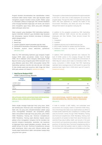Program tersebut disosialisasikan dan dipublikasikan melalui broadcast dalam bentuk tautan video agar karyawan dapat mengakses program tersebut secara mudah. Melalui upaya ini, diharapkan pekerja di lingkungan PHE memiliki kesadaran untuk menjaga kesehatan lingkungan, diri sendiri, dan sesama serta mengetahui gaya hidup sehat yang perlu diterapkan dalam kehidupan sehari-hari.Selain program yang disediakan PHE Subholding Upstream, layanan kesehatan ekstensif juga disediakan bagi karyawan dan keluarganya. Layanan tersebut mencakup di antaranya adalah sebagai berikut:1. Rawat jalan.2. Rawat inap.3. Layanan tambahan seperti perawatan gigi dan mata.4. Fasilitas BPJS Kesehatan untuk pekerja dan keluarganya.5. Tambahan asuransi sesuai kebutuhan operasional.[GRI 403-6, 11.9.7]Selain itu, PHE Subholding Upstream juga mengukur tingkat budaya HSSE dalam perusahaan melalui Survei Budaya HSSE. Hal ini dilakukan untuk mengukur ketercapaian HSSE Beyond Culture yang mengarah pada HSSE Generatif. Survei yang dilakukan pada tahun 2024 menunjukkan bahwa PHE Subholding Upstream memiliki nilai rata-rata skor 4,25 (skala 5) atau berada pada level proactive, lebih tinggi dari tahun 2023 yaitu sebesar 4,21 (skala 5). [SASB EM-EP-320a.2]The program is disseminated and published through broadcasts in the form of video links so that employees can access the program easily. Through this effort, it is expected that workers within PHE have awareness to maintain the health of the environment, themselves, and others and know the healthy lifestyle that needs to be applied in everyday life.In addition to the programs provided by PHE Subholding Upstream, extensive health services are also provided for employees and their families. These services include the following:1. Outpatient.2. Inpatient.3. Additional services such as dental and eye care.4. BPJS Health Facilities for workers and their families.5. Additional insurance according to operational needs[GRI 403-6, 11.9.7]In addition, PHE Subholding Upstream also measures the level of HSSE culture in the company through the HSSE Culture Survey. This is done to measure the achievement of HSSE Beyond Culture which leads to Generative HSSE. The survey conducted in 2024 showed that PHE Subholding Upstream had an average score of 4.25 (scale 5) or was at the proactive level, higher than in 2023 which was 4.21 (scale 5). [SASB EM-EP-320a.2]UraianDescription 2024 2023 2022Jumlah LokasiTotal Location 30 29 18SkorScore 4,25 4,21 4,08Level ProaktifProactiveProaktifProactiveProaktifProactiveHasil Survei Budaya HSSEHSSE Culture Survey ResultsPELATIHAN KESELAMATAN DAN KESEHATAN KERJA DAN LINDUNG LINGKUNGAN [GRI 403-5]Dalam rangka menjaga lingkungan kerja yang aman, sehat, dan berkelanjutan, Perseroan perlu menerapkan HSSE Policy. Salah satu hal yang perlu diimplementasikan adalah upaya untuk meningkatkan kesadaran dan kompetensi pekerja dalam menciptakan lingkungan kerja yang aman, yaitu melalui HSSE Mandatory Training dan Technical Competencies. HSSE Mandatory Training wajib diberikan kepada seluruh pekerja untuk mengajarkan mengenai hal-hal mendasar dan esensial mengenai keselamatan, kesehatan, dan keamanan di lingkungan kerja, seperti kebijakan, prosedur, standar, dan praktik lainnya. Di sisi lain, Technical Competencies merujuk pada kemampuan teknis yang perlu dikuasai pekerja agar mereka dapat berkontribusi dalam menciptakan budaya kerja yang aman dan nyaman.OCCUPATIONAL SAFETY AND HEALTH AND ENVIRONMENTAL PROTECTION TRAINING [GRI 403-5]In order to maintain a safe, healthy, and sustainable work environment, the Company needs to implement HSSE Policy. One of the things that needs to be implemented is an effort to increase worker awareness and competence in creating a safe work environment, namely through HSSE Mandatory Training and Technical Competencies. HSSE Mandatory Training must be provided for all workers to teach them about the basic and essential things about safety, health, and security in the work environment, such as policies, procedures, standards, and other practices. On the other hand, Technical Competencies refer to the technical skills that workers need to master so that they can contribute to creating a safe and comfortable work culture.010203040506070809 Safe and Comfortable Working Environment For Excellent PHE People Lingkungan Kerja yang Aman dan Nyaman untuk Insan PHE yang Unggul1011 PT Pertamina Hulu Energi 267