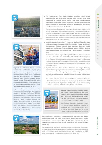a. Tim Pengembangan Aset Utara melakukan terobosan inisiatif berupa digitalisasi peta area sumur serta rekayasa desain casing 2 string pada 8 pemboran di Lapangan Minyak Bangko - WK Rokan terbukti berhasil menghemat biaya operasi hingga Rp54 miliar. Dengan proyeksi rencana pemboran hingga 57 sumur pada akhir 2024, PT Pertamina Hulu Rokan berpotensi menghemat hingga Rp414 miliar.The Northern Asset Development Team made a breakthrough initiative in the form of digitizing well area maps and engineering 2 string casing designs on 8 drillings in the Bangko Oil Field - Rokan Working Area, which has proven to be successful in saving operating costs of up to Rp54 billion. With a projected drilling plan of up to 57 wells by the end of 2024, PT Pertamina Hulu Rokan has the potential to save up to Rp414 billion.b. Regional Indonesia Timur melalui PT Pertamina Hulu Energi Tuban East Java, meraih penghargaan Kecelakaan Nihil (Zero Accident Award) dari Menteri Ketenagakerjaan Republik Indonesia yang diserahkan diserahkan melalui Disnakertrans Provinsi Jawa Timur merujuk pada capaian 4.526.844 jam kerja orang tanpa kecelakaan kerja terhitung sejak 1 November 2019 - 31 Oktober 2023.The Eastern Indonesia Regional through PT Pertamina Hulu Energi Tuban East Java, achieved the Zero Accident Award from the Minister of Manpower of the Republic of Indonesia which was presented through the East Java Provincial Manpower and Transmigration Office referring to the achievement of 4,526,844 working hours without work accidents from November 1, 2019 to October 31, 2023.c. Regional Indonesia Timur melalui Pertamina EP Donggi Matindok, mendapatkan penghargaan internasional Concerned Company/Corporation Award 2024 dari World Safety Organization (WSO) dengan kumulatif jam kerja selamat sejak beroperasi pada 2017 hingga 21 Oktober 2024 sebesar 11.078.070.The Eastern Indonesia Region through Pertamina EP Donggi Matindok, achieved the international Concerned Company/Corporation Award 2024 from the World Safety Organization (WSO) with cumulative safe working hours since operating in 2017 to October 21, 2024 of 11,078,070.OKT15Regional Sumatra Subholding Upstream melalui PT Pertamina Hulu Rokan, meraih pencapaian luar biasa yang disebut sebagai 'Big Hitter' melalui pengeboran 2 sumur minyak utama di WK Rokan, yakni sumur Pinang #68 dengan produksi 1.020 BOPD dan sumur Pudu #23 dengan produksi 967 BOPD.Sumatra Regional Subholding Upstream through PT Pertamina Hulu Rokan, achieved an extraordinary achievement called 'Big Hitter' by drilling 2 main oil wells in WK Rokan, namely the Pinang #68 well with a production of 1,020 BOPD and the Pudu #23 well with a production of 967 BOPD.Regional 4 Indonesia Timur, berhasil menemukan sumberdaya migas yang signifikan melalui pengeboran sumur Eksplorasi Tedong (TDG)-001 di Field Donggi Matindok WK Pertamina EP, Kabupaten Morowali Utara, provinsi Sulawesi Tengah. Struktur temuan Tedong ini memiliki kolom hidrokarbon setebal 163 meter, dengan laju alir 15 juta kaki kubik per hari (MMSCFD), dan 185 barel kondensat per hari (BCPD).Regional 4 Eastern Indonesia successfully discovered significant oil and gas resources through the drilling of the Tedong (TDG)-001 Exploration well in the Donggi Matindok Field, Pertamina EP Working Area, North Morowali Regency, Central Sulawesi Province. The Tedong discovery features a hydrocarbon column measuring 163 meters in thickness, with a flow rate of 15 million standard cubic feet per day (MMSCFD) and 185 barrels of condensate per day (BCPD).OKT19NOV4Regional Jawa Subholding Upstream melalui PHE OSES, resmi menyalurkan gas bumi sebesar 5 BBUTD dengan total volume sebesar 9.977 BBTU ke Pembangkit Listrik Tenaga Gas dan Uap (PLTGU) di Cilegon terhitung 1 November 2024 sampai tahun 2029.Java Regional Subholding Upstream through PHE OSES, officially distributed 5 BBUTD of natural gas with a total volume of 9,977 BBTU to the Gas and Steam Power Plant (PLTGU) in Cilegon starting from November 1, 2024 to 2029.NOV101 2024 Performance Performa 202402030405060708091011 PT Pertamina Hulu Energi 25