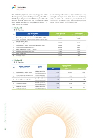 No. Topik Pelatihan K3K3 Training TopicsDurasi PelatihanTraining DurationJumlah PesertaNumber of Participants1 Sistem Pengamatan dan Intervensi HSSE (PEKA / BBS)HSSE Observation and Intervention System (PEKA / BBS) 141.070 17.3502 Perilaku Hidup SehatHealthy Living Behavior 184.795 15.1653 Corporate Life Saving Rules (CLSR) & Golden Rules 74.618 7.4964 Process Safety Awareness (CBT) 23.608 2.3595 Basic Sea Survival / HUET / T-BOSIET 12.570 1.0796 Incident Command System (ICS) 12.360 4387 HSSE Leadership 10.510 7348 Confined Space 11.920 293Pelatihan K3OHS TrainingPHE Subholding Upstream telah menyelenggarakan HSSE Mandatory Training secara rutin bagi karyawannya. Pada tahun 2024, terdapat 302 pelatihan terkait K3LL dengan total waktu pelatihan sebanyak 764.816 jam dan total peserta 50.659 orang. Rerata jam pelatihan yang berkaitan dengan K3LL adalah 15,1 jam per karyawan. PHE Subholding Upstream has regularly held HSSE Mandatory Training for its employees. In 2024, there were 302 trainings related to HSSE with a total training time of 764,816 hours and a total of 50,659 participants. The average training hours related to HSSE were 15.1 hours per employee.No. Wilayah OperasionalOperational AreaSatuanSatuanJumlah PelatihanTotal Training2024 2023 20221. Corporate Life Saving Rules Peserta pelatihanTraining participants 7.496 24.801 2.3432. Process Safety Management dan AwarenessPeserta pelatihanTraining participants 2.384 3.598 313. Incident Command System Peserta pelatihanTraining participants 439 15 974. Training SUPREME Peserta pelatihanTraining participants 668 1.183 1.2565. Pelatihan First AidPelatihan First AidPeserta pelatihanTraining participants 431 203 161Pelatihan K3OHS TrainingHULU ENERGILaporan Keberlanjutan %u2022 Sustainability Report 268