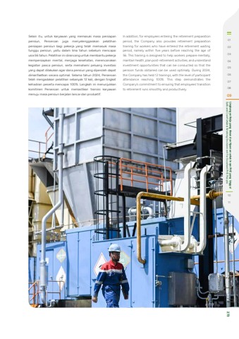 Selain itu, untuk karyawan yang memasuki masa persiapan pensiun, Perseroan juga menyelenggarakan pelatihan persiapan pensiun bagi pekerja yang telah memasuki masa tunggu pensiun, yaitu dalam lima tahun sebelum mencapai usia 56 tahun. Pelatihan ini dirancang untuk membantu pekerja mempersiapkan mental, menjaga kesehatan, merencanakan kegiatan pasca pensiun, serta memahami peluang investasi yang dapat dilakukan agar dana pensiun yang diperoleh dapat dimanfaatkan secara optimal. Selama tahun 2024, Perseroan telah mengadakan pelatihan sebanyak 12 kali, dengan tingkat kehadiran peserta mencapai 100%. Langkah ini menunjukkan komitmen Perseroan untuk memastikan transisi karyawan menuju masa pensiun berjalan lancar dan produktif.In addition, for employees entering the retirement preparation period, the Company also provides retirement preparation training for workers who have entered the retirement waiting period, namely within five years before reaching the age of 56. This training is designed to help workers prepare mentally, maintain health, plan post-retirement activities, and understand investment opportunities that can be conducted so that the pension funds obtained can be used optimally. During 2024, the Company has held 12 trainings, with the level of participant attendance reaching 100%. This step demonstrates the Company%u2019s commitment to ensuring that employees%u2019 transition to retirement runs smoothly and productively.PT Pertamina Hulu Energi 273010203040506070809 Safe and Comfortable Working Environment For Excellent PHE People Lingkungan Kerja yang Aman dan Nyaman untuk Insan PHE yang Unggul1011