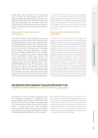 Sebagai bagian dari Grup Pertamina, PHE menggunakan saluran komunikasi 135 yang beroperasi selama 24 jam setiap hari sebagai sarana penerimaan saran dan keluhan dari masyarakat. Setiap laporan yang diterima akan dikelola oleh fungsi Corporate Secretary dan diteruskan ke pihak terkait untuk ditindaklanjuti. Sepanjang tahun 2024, tidak ada laporan keluhan dari masyarakat mengenai dampak operasional PHE. [GRI 2-25, 411-1, 11.16]PENEGAKAN HAM DI LINGKUNGAN MASYARAKATSelain dalam lingkungan pekerja, perusahaan juga memberi dukungan pada nilai-nilai universal HAM terhadap penduduk asli/masyarakat adat yang ada di sekitar wilayah kerja PHE Subholding Upstream. Perusahaan selalu menjunjung tinggi hal-hak masyarakat adat, seperti hak atas kepemilikan tanah, hak sosial, hak ekonomi, hak budaya, serta hak partisipasi efektif masyarakat adat. Dalam perjalanannya, perusahaan juga selalu melibatkan masyarakat adat/lokal dan menghargai hak kolektif masyarakat atas aspirasi mereka terhadap rencana pengembangan program yang diusulkan pada wilayah mereka. Prinsip ini sejalan dengan Free, Prior, and Informed Consent (FPIC) yang menjadi Pedoman Pengelolaan Tanggung Jawab Sosial dan Lingkungan (TJSL) No.A13-003/PHE01000/2021-S9. Prinsip FPIC diintegrasikan dalam kebijakan dan pedoman yang diterapkan dalam lingkup PHE. Selain itu, PHE juga menyusun Standard Operating Procedure (SOP) audit untuk implementasi kebijakan HAM dan memastikan implementasi HAM pada seluruh kontrak penyedia keamanan. Pada tahun 2024, tidak ada laporan mengenai insiden HAM yang terkait hak-hak masyarakat adat.As a part of Pertamina Group, PHE uses the communication channel 135 which operates 24 hours a day as a means of receiving suggestions and complaints from the public. Every report received will be managed by the Corporate Secretary function and forwarded to the relevant parties for followup. Throughout 2024, there were no reports of complaints from the public regarding the impact of operations of PHE. [GRI 2-25, 411-1, 11.16]ENFORCEMENT OF HUMAN RIGHTS IN COMMUNITYIn addition to the work environment, the company also supports universal human rights values for indigenous people/indigenous communities around the working areas of PHE Subholding Upstream. The company always upholds the rights of indigenous peoples, such as the right to land ownership, social rights, economic rights, cultural rights, and the right to effective participation of indigenous peoples. In its journey, the company also always involves indigenous/local communities and respects the collective rights of the community for their aspirations regarding the proposed program development plans in their area. This principle is in line with Free, Prior, and Informed Consent (FPIC) which becomes Guideline for Management of Social and Environmental Responsibility (TJSL) No.A13-003/PHE01000/2021-S9. The FPIC principle is integrated into the policies and guidelines applied within the scope of PHE. In addition, PHE also prepares a Standard Operating Procedure (SOP) for audits to implement human rights policies and ensures the implementation of human rights in all security provider contracts. In 2024, there were no reports of human rights incidents related to indigenous peoples%u2019 rights.PHE Subholding Upstream menyadari pentingnya Program CID (Community Involvement & Development) atau program pengembangan masyarakat di sekitar wilayah kerja perusahaan, karena merupakan bagian dari tanggung jawab dan praktik keberlanjutan dalam kegiatan sosial perusahaan. Program ini diyakini dapat secara efektif membangun kepercayaan dan kemitraan yang berupa simbiosis mutualisme antara perusahaan migas dengan masyarakat dan komunitas lokal, sekaligus dapat meningkatkan citra positif perusahaan.PHE Subholding Upstream realizes the importance of the CID (Community Involvement & Development) Program or the community development program around the company%u2019s working areas, because it is a part of the responsibility and sustainability practices in the company%u2019s social activities. This program is believed to be able to effectively build trust and partnerships in the form of mutual symbiosis between the oil and gas company and local communities, while also being able to improve the company%u2019s positive image.PELIBATAN MASYARAKAT DALAM KEGIATAN TJSLCOMMUNITY INVOLVEMENT IN TJSL ACTIVITIES [OJK F.24] [IPIECA SOC-9]01020304050607080910Generating Shared Value for the Community Menciptakan Nilai Bersama bagi Masyarakat11 PT Pertamina Hulu Energi 279