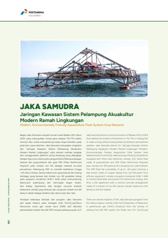 Bagan Jaka Samudra menjadi inovasi sosial Badak LNG tahun 2024 yang mewujudkan mimpi para nelayan Tihi-Tihi dalam mencari ikan untuk menyambung hidup tanpa terbatas pada jarak dan cuaca ekstrem. Jaka Samudra merupakan singkatan dari %u201cJaringan Kawasan Sistem Pelampung Akuakultur Modern Ramah Lingkungan%u201d yaitu sebuah metode tangkap ikan menggunakan platform jaring terapung yang dilengkapi dengan tiga unsur utama yaitu yang pertama Pelampung bagan terbuat dari polyurethane dan pipa FRP (Fiber Reinforced Polymer) yaitu limbah non B3 sebagai material ex-used perusahaan. Pelampung FRP ini memiliki ketahanan hingga >40 tahun. Kedua, Sensor kebocoran yang terbuat dari tubing tembaga yang berasal dari limbah non B3 peralatan kilang yaitu propane condensor (E4E-1 A/B) untuk memonitoring kebocoran pelampung dan mencegah bagan karam. Dan ketiga, Apartemen ikan dengan susunan konkret berbentuk vertikal yang terbuat dari campuran limbah non B3 kalsium silikat sebagai atraktor ikan dan hunian ikan-ikan. Terdapat beberapa dampak dari program Jaka Samudra dari aspek Nature yakni terdapat 0,26 TonCO2eq/Tahun Penurunan emisi gas rumah kaca (GRK) dari aktivitas pemanfaatan limbah Non B3 FRP menjadi pelampung dan 0,11 JAKA SAMUDRAJaringan Kawasan Sistem Pelampung Akuakultur Modern Ramah LingkunganModern, Environmentally Friendly Aquaculture Float System Area NetworkJaka Samudra frame is a social innovation of Badak LNG in 2024 that realized the dreams of fishermen in Tihi-Tihi in finding fish to make a living without being limited by distance and extreme weather. Jaka Samudra stands for %u201cJaringan Kawasan Sistem Pelampung Aquakultur Modern Ramah Lingkungan%u201d (Modern, Environmentally Friendly Aquaculture Float System Area Network) which is a fishing method using a floating net platform equipped with three main elements, namely, first, frame float made of polyurethane and FRP (Fiber Reinforced Polymer) pipe, namely non-B3 waste as the company%u2019s ex-used material. This FRP float has a durability of up to >40 years. Second, a leak sensor made of copper tubing from non-B3 waste from refinery equipment, namely a propane condenser (E4E-1 A/B) to monitor float leaks and prevent the frame from sinking. And third, a fish apartment with a vertical concrete arrangement made of a mixture of non-B3 calcium silicate waste as a fish attractor and fish habitat.There are several impacts of the Jaka Samudra program from the Nature aspect, namely 0.26 TonCO2eq/Year of Reduction in greenhouse gas (GHG) emissions from the activity of utilizing Non-B3 FRP waste into floats and 0.11 TonCO2eq/HULU ENERGILaporan Keberlanjutan %u2022 Sustainability Report 282