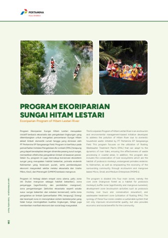 Program Ekoriparian Sungai Hitam Lestari merupakan inisiatif berbasis ekowisata dan pengelolaan lingkungan yang dikembangkan untuk mengatasi pencemaran Sungai Hitam akibat limbah domestik rumah tangga yang diinisiasi oleh PT Pertamina EP Sangasanga Field. Program ini berfokus pada pemanfaatan Instalasi Pengelolaan Air Limbah (IPAL) terapung yang dapat beradaptasi dengan dinamika pasang surut sungai, memastikan efektivitas pengolahan limbah di kawasan pesisir. Selain itu, program ini juga mencakup konservasi ekosistem sungai yang merupakan habitat bekantan, primata endemik Kalimantan yang terancam punah, serta pemberdayaan ekonomi masyarakat sekitar melalui ekowisata dan Usaha Mikro, Kecil, dan Menengah (UMKM) berbasis mangrove.Program ini terbagi dalam empat zona utama, yaitu zona inti (hutan mangrove sebagai habitat bekantan), zona penyangga (agroforestry dan pembibitan mangrove), zona pengembangan (aktivitas ekowisata seperti wisata susur sungai bekantan dan edukasi konservasi), serta zona pengolahan air limbah (pemanfaatan IPAL terapung). Sinergi dari keempat zona ini menciptakan sistem berkelanjutan yang tidak hanya meningkatkan kualitas lingkungan, tetapi juga memberikan manfaat ekonomi dan sosial bagi masyarakat.The Ecoriparian Program of Hitam Lestari River is an ecotourism and environmental management-based initiative developed to address the pollution of Hitam River due to domestic household waste initiated by PT Pertamina EP Sangasanga Field. This program focuses on the utilization of floating Wastewater Treatment Plants (IPAL) that can adapt to the dynamics of river tides, ensuring the effectiveness of waste processing in coastal areas. In addition, this program also includes the conservation of river ecosystems which are the habitat of proboscis monkeys, endangered primates endemic to Kalimantan, as well as empowering the economy of the surrounding community through ecotourism and mangrove based Micro, Small, and Medium Enterprises (MSMEs).The program is divided into four main zones, namely the core zone (mangrove forest as a habitat for proboscis monkeys), buffer zone (agroforestry and mangrove nurseries), development zone (ecotourism activities such as proboscis monkey river tours and conservation education), and wastewater treatment zone (utilization of floating IPAL). The synergy of these four zones creates a sustainable system that not only improves environmental quality, but also provides economic and social benefits for the community.PROGRAM EKORIPARIANSUNGAI HITAM LESTARIEcoriparian Program of Hitam Lestari RiverHULU ENERGILaporan Keberlanjutan %u2022 Sustainability Report 284