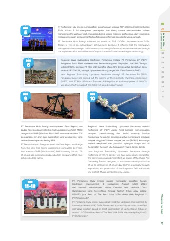 PT Pertamina Hulu Energi mendapatkan penghargaan sebagai TOP DIGITAL Implementation 2024 #Stars 5. Ini merupakan pencapaian luar biasa, karena mencerminkan bahwa manajemen Perusahaan telah mengelola bisnis secara modern, profesional, dan terpercaya melalui penerapan serta pemanfaatan teknologi informasi dan digital yang canggih.PT Pertamina Hulu Energi achieved an award as TOP DIGITAL Implementation 2024 #Stars 5. This is an extraordinary achievement, because it reflects that the Company's management has managed the business in a modern, professional, and reliable manner through the implementation and utilization of sophisticated information and digital technology.Regional Jawa Subholding Upstream Pertamina melalui PT Pertamina EP (PEP) Pangkalan Susu Field melaksanakan Penandatanganan Perjanjian Jual Beli Tenaga Listrik (PJBTL) dengan PT PLN UID Sumatra Utara UP3 Binjai untuk tambahan daya sebesar 131.000 VA, sebagai upaya mendukung target Net Zero Emission 2060.Java Regional Subholding Upstream Pertamina through PT Pertamina EP (PEP) Pangkalan Susu Field carried out the signing of the Electricity Purchase Agreement (PJBTL) with PT PLN UID North Sumatra UP3 Binjai for an additional power of 131,000 VA, as an effort to support the 2060 Net Zero Emission target.PT Pertamina Hulu Energi mendapatkan Final Report dan Badge hasil penilaian ESG Risk Rating Assessment oleh MSCI dengan hasil BBB (Medium Risk). PHE termasuk kedalam 17% perusahaan Oil and Gas exploration and production yang berhasil mendapatkan Rating BBB.PT Pertamina Hulu Energi received the Final Report and Badge from the ESG Risk Rating Assessment conducted by MSCI, with a result of BBB (Medium Risk). PHE is among the top 17% of oil and gas exploration and production companies that have achieved a BBB rating.DES5DES6DES9 PT Pertamina Hulu Energi sukses menggelar kegiatan Forum Upstream Improvement & Innovation Award (UIIA) 2024 dan berhasil membukukan Value Creation real berbasis Cost Optimization yang terverifikasi hingga Rp2,57 triliun atau sekitar USD170 juta. Best of The Best' UIIA 2024 diraih oleh Regional 2 PT Pertamina EP.PT Pertamina Hulu Energi successfully held the Upstream Improvement & Innovation Award (UIIA) 2024 Forum and successfully recorded a verified real Value Creation based on Cost Optimization of up to Rp2.57 trillion or around USD170 million. Best of The Best' UIIA 2024 was won by Regional 2 PT Pertamina EP.DES11-13Regional Jawa Subholding Upstream Pertamina melalui Pertamina EP (PEP) Jambi Field berhasil menyelesaikan tahapan commissioning dan initial start-up Stasiun Pengumpul Puspa Asri dirancang untuk menampung produksi minyak hingga 600 barel minyak per hari (BOPD), khususnya melalui eksplorasi dan produksi lapangan Puspa Asri di Kecamatan Kumpeh Ulu, Kabupaten Muaro Jambi, Jambi.Java Regional Subholding Upstream Pertamina through Pertamina EP (PEP) Jambi Field has successfully completed the commissioning and initial start-up stages of the Puspa Asri Gathering Station designed to accommodate oil production of up to 600 barrels of oil per day (BOPD), especially through exploration and production of the Puspa Asri field in Kumpeh Ulu District, Muaro Jambi Regency, Jambi.DES1001 2024 Performance Performa 202402030405060708091011 PT Pertamina Hulu Energi 27