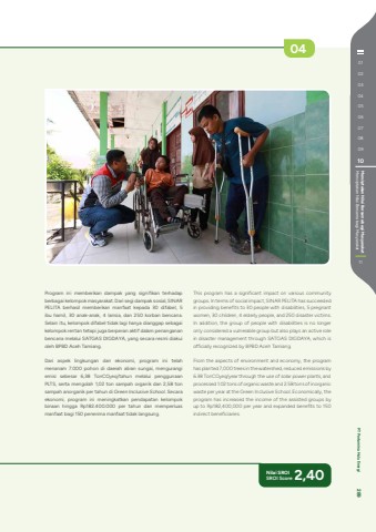 Program ini memberikan dampak yang signifikan terhadap berbagai kelompok masyarakat. Dari segi dampak sosial, SINAR PELITA berhasil memberikan manfaat kepada 30 difabel, 5 ibu hamil, 30 anak-anak, 4 lansia, dan 250 korban bencana. Selain itu, kelompok difabel tidak lagi hanya dianggap sebagai kelompok rentan tetapi juga berperan aktif dalam penanganan bencana melalui SATGAS DIGDAYA, yang secara resmi diakui oleh BPBD Aceh Tamiang.Dari aspek lingkungan dan ekonomi, program ini telah menanam 7.000 pohon di daerah aliran sungai, mengurangi emisi sebesar 6,38 TonCO%u2082eq/tahun melalui penggunaan PLTS, serta mengolah 1,02 ton sampah organik dan 2,58 ton sampah anorganik per tahun di Green Inclusive School. Secara ekonomi, program ini meningkatkan pendapatan kelompok binaan hingga Rp182.400.000 per tahun dan memperluas manfaat bagi 150 penerima manfaat tidak langsung.This program has a significant impact on various community groups. In terms of social impact, SINAR PELITA has succeeded in providing benefits to 30 people with disabilities, 5 pregnant women, 30 children, 4 elderly people, and 250 disaster victims. In addition, the group of people with disabilities is no longer only considered a vulnerable group but also plays an active role in disaster management through SATGAS DIGDAYA, which is officially recognized by BPBD Aceh Tamiang.From the aspects of environment and economy, the program has planted 7,000 trees in the watershed, reduced emissions by 6.38 TonCO%u2082eq/year through the use of solar power plants, and processed 1.02 tons of organic waste and 2.58 tons of inorganic waste per year at the Green Inclusive School. Economically, the program has increased the income of the assisted groups by up to Rp182,400,000 per year and expanded benefits to 150 indirect beneficiaries.Nilai SROI SROI Score2,400401020304050607080910Menciptakan Nilai Bersama bagi Masyarakat Menciptakan Nilai Bersama bagi Masyarakat11 PT Pertamina Hulu Energi 289
