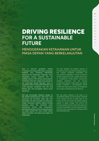 DRIVING RESILIENCEFOR A SUSTAINABLE FUTUREMENGGERAKAN KETAHANAN UNTUK MASA DEPAN YANG BERKELANJUTANTema ini menyoroti pendekatan strategis PT Pertamina Hulu Energi (PHE) dalam membangun ketahanan yang mendukung keberlanjutan operasional dan keberlanjutan lingkungan. Dalam menghadapi ancaman perubahan iklim dan volatilitas ekonomi, PHE berfokus pada penguatan infrastruktur tahan iklim, mitigasi risiko operasional, dan pengurangan dampak lingkungan. Upaya ini diwujudkan melalui investasi pada infrastruktur yang ramah lingkungan, pengelolaan risiko iklim yang berbasis data, serta peningkatan efisiensi proses operasional. PHE juga menempatkan ketahanan sebagai inti dari strategi keberlanjutannya, tidak hanya untuk melindungi aset perusahaan tetapi juga untuk menciptakan nilai bagi masyarakat dan lingkungan. Dengan membangun kapasitas adaptasi terhadap perubahan global, PHE memastikan bahwa pertumbuhan ekonomi tidak mengorbankan keberlanjutan ekosistem. Tema ini merepresentasikan visi jangka panjang PHE untuk menjadi pelopor dalam menciptakan masa depan yang tangguh dan berkelanjutan.This topic highlights the strategic approach of PT Pertamina Hulu Energi (PHE) in building resilience that supports operational sustainability and environmental sustainability. In facing the threat of climate change and economic volatility, PHE focuses on strengthening climate-resilient infrastructure, mitigating operational risks, and reducing environmental impacts. These efforts are realized through investment in environmentally friendly infrastructure, data-based climate risk management, and increase of operational process efficiency.PHE also places resilience at the heart of its sustainability strategy, not only to protect the assets of the company but also to create value for the society and the environment. By building adaptive capacity to global changes, PHE ensures that economic growth does not come at the expense of ecosystem sustainability. This topic represents PHE's long-term vision to be a pioneer in creating a resilient and sustainable future.0102030405060708091011 PT Pertamina Hulu Energi 1