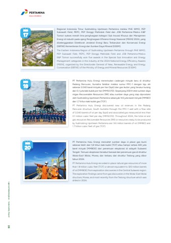 PT Pertamina Hulu Energi menemukan cadangan minyak baru di struktur Padang Pancuran, Sumatra Selatan melalui sumur PPC-1 dengan laju alir sebesar 2.040 barel minyak per hari (bph) dan gas ikutan yang terukur kurang dari 0,1 juta kaki kubik per hari (MMSCFD). Sepanjang 2024 total sumber daya migas Recoverable Resources (RR) atau sumber daya yang siap diproduksi oleh Subholding Upstream Pertamina sebanyak 143 juta barel minyak (MMBO) dan 1,7 triliun kaki kubik gas (TCF).PT Pertamina Hulu Energi discovered new oil reserves in the Padang Pancuran structure, South Sumatra through the PPC-1 well with a flow rate of 2,040 barrels of oil per day (bpd) and associated gas measured at less than 0.1 million cubic feet per day (MMSCFD). Throughout 2024, the total oil and gas resources Recoverable Resources (RR) or resources ready to be produced by Subholding Upstream Pertamina are 143 million barrels of oil (MMBO) and 1.7 trillion cubic feet of gas (TCF).DES18DES20PT Pertamina Hulu Energi mencatat sumber daya in place gas bumi sebesar lebih dari 1,8 triliun kaki kubik (TCF) atau hampir setara 320 juta barel minyak (MMBOE) dari penemuan eksplorasi di wilayah Sulawesi Tengah. Temuan eksplorasi tersebut berasal dari penemuan gas di struktur Wolai-East Wolai, Morea, dan terbaru dari struktur Tedong yang dibor tahun 2024.PT Pertamina Hulu Energi recorded in-place natural gas resources of more than 1.8 trillion cubic feet (TCF) or almost equivalent to 320 million barrels of oil (MMBOE) from exploration discoveries in the Central Sulawesi region. The exploration findings came from gas discoveries in the Wolai-East Wolai structure, Morea, and most recently from the Tedong structure which was drilled in 2024.DES17Regional Indonesia Timur Subholding Upstream Pertamina melalui PHE WMO, PEP Sukowati Field, PEPC, PEP Donggi Matindok Field dan JOB Pertamina-Medco E&P Tomori sukses meraih lima penghargaan kategori Sub Inovasi Khusus dan Manajemen Energi di industri pada ajang Penghargaan Efisiensi Energi Nasional (PEEN) 2024, yang diselenggarakan Direktorat Jenderal Energi Baru Terbarukan dan Konservasi Energi (EBTKE) Kementerian Energi dan Sumber Daya Mineral (ESDM).The Eastern Indonesia Region of Subholding Upstream Pertamina through PHE WMO, PEP Sukowati Field, PEPC, PEP Donggi Matindok Field and JOB Pertamina-Medco E&P Tomori successfully won five awards in the Special Sub Innovation and Energy Management categories in the industry at the 2024 National Energy Efficiency Awards (PEEN), organized by the Directorate General of New, Renewable Energy and Energy Conservation (EBTKE) of the Ministry of Energy and Mineral Resources (ESDM).HULU ENERGILaporan Keberlanjutan %u2022 Sustainability Report 28