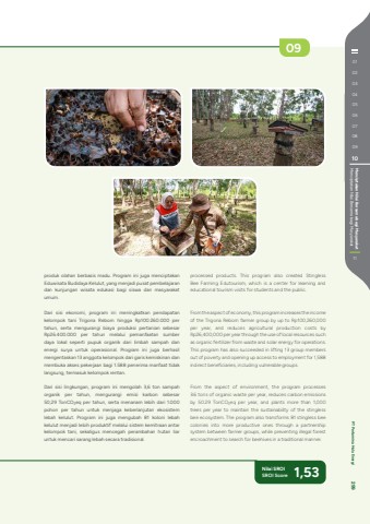produk olahan berbasis madu. Program ini juga menciptakan Eduwisata Budidaya Kelulut, yang menjadi pusat pembelajaran dan kunjungan wisata edukasi bagi siswa dan masyarakat umum.Dari sisi ekonomi, program ini meningkatkan pendapatan kelompok tani Trigona Reborn hingga Rp100.260.000 per tahun, serta mengurangi biaya produksi pertanian sebesar Rp26.400.000 per tahun melalui pemanfaatan sumber daya lokal seperti pupuk organik dari limbah sampah dan energi surya untuk operasional. Program ini juga berhasil mengentaskan 13 anggota kelompok dari garis kemiskinan dan membuka akses pekerjaan bagi 1.588 penerima manfaat tidak langsung, termasuk kelompok rentan.Dari sisi lingkungan, program ini mengolah 3,6 ton sampah organik per tahun, mengurangi emisi karbon sebesar 50,29 TonCO%u2082eq per tahun, serta menanam lebih dari 1.000 pohon per tahun untuk menjaga keberlanjutan ekosistem lebah kelulut. Program ini juga mengubah 81 koloni lebah kelulut menjadi lebih produktif melalui sistem kemitraan antar kelompok tani, sekaligus mencegah perambahan hutan liar untuk mencari sarang lebah secara tradisional.processed products. This program also created Stingless Bee Farming Edutourism, which is a center for learning and educational tourism visits for students and the public.From the aspect of economy, this program increases the income of the Trigona Reborn farmer group by up to Rp100,260,000 per year, and reduces agricultural production costs by Rp26,400,000 per year through the use of local resources such as organic fertilizer from waste and solar energy for operations. This program has also succeeded in lifting 13 group members out of poverty and opening up access to employment for 1,588 indirect beneficiaries, including vulnerable groups.From the aspect of environment, the program processes 3.6 tons of organic waste per year, reduces carbon emissions by 50.29 TonCO%u2082eq per year, and plants more than 1,000 trees per year to maintain the sustainability of the stingless bee ecosystem. The program also transforms 81 stingless bee colonies into more productive ones through a partnership system between farmer groups, while preventing illegal forest encroachment to search for beehives in a traditional manner.Nilai SROI SROI Score 1,530901020304050607080910Menciptakan Nilai Bersama bagi Masyarakat Menciptakan Nilai Bersama bagi Masyarakat11 PT Pertamina Hulu Energi 299