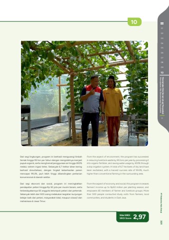 Dari segi lingkungan, program ini berhasil mengurangi limbah ternak hingga 95 ton per tahun dengan mengolahnya menjadi pupuk organik, serta menghemat penggunaan air hingga 300% melalui sistem irigasi tetes. Sebanyak 6,7 hektar lahan kering berhasil direvitalisasi, dengan tingkat keberhasilan panen mencapai 99,3%, jauh lebih tinggi dibandingkan pertanian konvensional di daerah sekitar.Dari segi ekonomi dan sosial, program ini meningkatkan pendapatan petani hingga Rp 50 juta per musim tanam, serta terberdayakannya 65 anggota kelompok petani dan peternak. Sebanyak lebih dari 500 orang melakukan kegiatan kunjungan belajar baik dari petani, masyarakat lokal, maupun siswa/i dan mahasiswa di Jawa Timur. From the aspect of environment, the program has succeeded in reducing livestock waste by 95 tons per year by processing it into organic fertilizer, and saving water usage by 300% through a drip irrigation system. A total of 6.7 hectares of dry land have been revitalized, with a harvest success rate of 99.3%, much higher than conventional farming in the surrounding area.From the aspect of economy and social, this program increases farmers' income up to Rp50 million per planting season, and empowers 65 members of farmer and livestock groups. More than 500 people conducted study visits from farmers, local communities, and students in East Java.Nilai SROI SROI Score 2,971001020304050607080910Menciptakan Nilai Bersama bagi Masyarakat Menciptakan Nilai Bersama bagi Masyarakat11 PT Pertamina Hulu Energi 301
