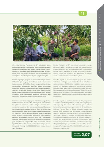 Ultra High Density Plantation (UHDP) diterapkan dalam perkebunan mangga, menggunakan sistem sprinkle dan panel surya untuk irigasi yang lebih efisien. Dengan konsep inklusif, program ini melibatkan berbagai elemen masyarakat, termasuk lansia, janda, penyandang disabilitas, dan keluarga PMI, guna menciptakan ekosistem pemberdayaan yang berkelanjutan.Dari sisi lingkungan, program ini telah melakukan penanaman 1.705 bibit pohon, yang berkontribusi pada reduksi emisi karbon sebesar 0,73 tCO%u2082e. Selain itu, pengolahan limbah menghasilkan pengurangan signifikan dalam pencemaran lingkungan, termasuk sampah diaper yang diolah menjadi pot tanaman, serta limbah kotoran ternak yang diubah menjadi biogas. Upaya ini membantu mengurangi risiko banjir di Desa Compreng serta meningkatkan kesadaran masyarakat akan pentingnya pengelolaan limbah yang ramah lingkungan.Dari sisi ekonomi dan sosial, program ini berhasil mengentaskan 5,81% kemiskinan di Kabupaten Subang serta meningkatkan kesejahteraan kelompok rentan. Warjos Purnama telah memberikan pelatihan dan keterampilan kepada 62 peserta, sementara program edukasi Purnama Goes to School telah menjangkau 3.521 siswa, dan 120 orang melalui Purnama Goes to Community. Dari sisi ekonomi, sebanyak 19 dari 327 keluarga miskin di Desa Compreng telah terentaskan, serta beberapa kelompok rentan seperti 2 lansia, 11 janda, dan 3 penyandang disabilitas mendapatkan peningkatan pendapatan. Program ini juga menghasilkan penghematan biaya operasional sebesar Rp58.900.000 per tahun serta pendapatan kelompok Swarna Integrated Farming Rp250.000.000/tahun melalui inovasi yang diterapkan.Nilai SROI SROI Score 2,0711Density Plantation (UHDP) technology is applied in mango plantations, using a sprinkler system and solar panels for more efficient irrigation. With an inclusive concept, this program involves various elements of society, including the elderly, widows, people with disabilities, and PMI families, in order to create a sustainable empowerment ecosystem.From the aspect of environment, the program has planted 1,705 tree seedlings, which contributed to a reduction in carbon emissions of 0.73 tCO%u2082e. In addition, waste processing resulted in a significant reduction in environmental pollution, including diaper waste being processed into plant pots, and livestock waste being converted into biogas. These efforts help reduce the risk of flooding in Compreng Village and raise public awareness of the importance of environmentally friendly waste management.From the aspect of economy and social, this program has succeeded in eradicating 5.81% of poverty in Subang Regency and improving the welfare of vulnerable groups. Warjos Purnama has provided training and skills for 62 participants, while the Purnama Goes to School education program has reached 3,521 students, and 120 people through Purnama Goes to Community. From the aspect of economy, poverty of 19 out of 327 families in Compreng Village has been eradicated, and several vulnerable groups such as 2 elderly people, 11 widows, and 3 people with disabilities have increased their income. This program also resulted in operational cost savings of Rp58,900,000 per year and the income of the Swarna Integrated Farming group of Rp250,000,000/year through the innovations implemented.01020304050607080910Menciptakan Nilai Bersama bagi Masyarakat Menciptakan Nilai Bersama bagi Masyarakat11 PT Pertamina Hulu Energi 303