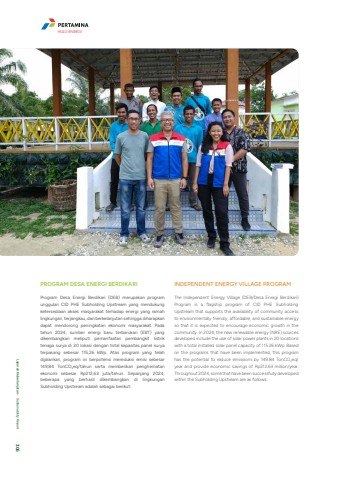 PROGRAM DESA ENERGI BERDIKARIProgram Desa Energi Berdikari (DEB) merupakan program unggulan CID PHE Subholding Upstream yang mendukung ketersediaan akses masyarakat terhadap energi yang ramah lingkungan, terjangkau, dan berkelanjutan sehingga diharapkan dapat mendorong peningkatan ekonomi masyarakat. Pada tahun 2024, sumber energi baru terbarukan (EBT) yang dikembangkan meliputi pemanfaatan pembangkit listrik tenaga surya di 20 lokasi dengan total kapasitas panel surya terpasang sebesar 115,26 kWp. Atas program yang telah dijalankan, program ini berpotensi mereduksi emisi sebesar 149,84 TonCO2eq/tahun serta memberikan penghematan ekonomi sebesar Rp212,63 juta/tahun. Sepanjang 2024, beberapa yang berhasil dikembangkan di lingkungan Subholding Upstream adalah sebagai berikut:INDEPENDENT ENERGY VILLAGE PROGRAMThe Independent Energy Village (DEB/Desa Energi Berdikari) Program is a flagship program of CID PHE Subholding Upstream that supports the availability of community access to environmentally friendly, affordable, and sustainable energy so that it is expected to encourage economic growth in the community. In 2024, the new renewable energy (NRE) sources developed include the use of solar power plants in 20 locations with a total installed solar panel capacity of 115.26 kWp. Based on the programs that have been implemented, this program has the potential to reduce emissions by 149.84 TonCO2eq/year and provide economic savings of Rp212.63 million/year. Throughout 2024, some that have been successfully developed within the Subholding Upstream are as follows:HULU ENERGILaporan Keberlanjutan %u2022 Sustainability Report 306