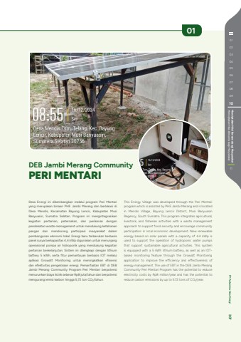 DEB Jambi Merang Community PERI MENTARIDesa Energi ini dikembangkan melalui program Peri Mentari yang merupakan binaan PHE Jambi Merang dan berlokasi di Desa Mendis, Kecamatan Bayung Lencir, Kabupaten Musi Banyuasin, Sumatra Selatan. Program ini mengintegrasikan kegiatan pertanian, peternakan, dan perikanan dengan pendekatan waste management untuk mendukung ketahanan pangan dan mendorong partisipasi masyarakat dalam pembangunan ekonomi lokal. Energi baru terbarukan berbasis panel surya berkapasitas 4,4 kWp digunakan untuk menunjang operasional pompa air hidroponik yang mendukung kegiatan pertanian berkelanjutan. Sistem ini dilengkapi dengan lithium battery 5 kWh, serta fitur pemantauan berbasis IOT melalui aplikasi Growatt Monitoring untuk meningkatkan efisiensi dan efektivitas pengelolaan energi. Pemanfaatan EBT di DEB Jambi Merang Community Program Peri Mentari berpotensi menurunkan biaya listrik sebesar Rp8 juta/tahun dan berpotensi mengurangi emisi karbon hingga 5,72 ton CO%u2082/tahun.This Energy Village was developed through the Peri Mentari program which is assisted by PHE Jambi Merang and is located in Mendis Village, Bayung Lencir District, Musi Banyuasin Regency, South Sumatra. This program integrates agricultural, livestock, and fisheries activities with a waste management approach to support food security and encourage community participation in local economic development. New renewable energy based on solar panels with a capacity of 4.4 kWp is used to support the operation of hydroponic water pumps that support sustainable agricultural activities. This system is equipped with a 5 kWh lithium battery, as well as an IOTbased monitoring feature through the Growatt Monitoring application to improve the efficiency and effectiveness of energy management. The use of EBT in the DEB Jambi Merang Community Peri Mentari Program has the potential to reduce electricity costs by Rp8 million/year and has the potential to reduce carbon emissions by up to 5.72 tons of CO%u2082/year.0101020304050607080910Menciptakan Nilai Bersama bagi Masyarakat Menciptakan Nilai Bersama bagi Masyarakat11 PT Pertamina Hulu Energi 307