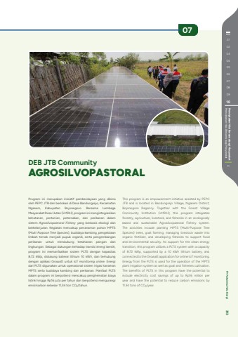 DEB JTB Community AGROSILVOPASTORAL09Program ini merupakan inisiatif pemberdayaan yang dibina oleh PEPC JTB dan berlokasi di Desa Bandungrejo, Kecamatan Ngasem, Kabupaten Bojonegoro. Bersama Lembaga Masyarakat Desa Hutan (LMDH), program ini mengintegrasikan kehutanan, pertanian, peternakan, dan perikanan dalam sistem Agrosilvopastoral Fishery yang berbasis ekologi dan berkelanjutan. Kegiatan mencakup penanaman pohon MPTS (Multi Purpose Tree Species), budidaya kambing, pengelolaan limbah ternak menjadi pupuk organik, serta pengembangan perikanan untuk mendukung ketahanan pangan dan lingkungan. Sebagai dukungan terhadap transisi energi bersih, program ini memanfaatkan sistem PLTS dengan kapasitas 8,72 kWp, didukung baterai lithium 10 kWh, dan terhubung dengan aplikasi Growatt untuk IoT monitoring online. Energi dari PLTS digunakan untuk operasional sistem irigasi tanaman MPTS serta budidaya kambing dan perikanan. Manfaat PLTS dalam program ini berpotensi mencakup penghematan biaya listrik hingga Rp16 juta per tahun dan berpotensi mengurangi emisi karbon sebesar 11,34 ton CO%u2082/tahun.This program is an empowerment initiative assisted by PEPC JTB and is located in Bandungrejo Village, Ngasem District, Bojonegoro Regency. Together with the Forest Village Community Institution (LMDH), this program integrates forestry, agriculture, livestock, and fisheries in an ecologically based and sustainable Agrosilvopastoral Fishery system. The activities include planting MPTS (Multi-Purpose Tree Species) trees, goat farming, managing livestock waste into organic fertilizer, and developing fisheries to support food and environmental security. As support for the clean energy transition, this program utilizes a PLTS system with a capacity of 8.72 kWp, supported by a 10 kWh lithium battery, and connected to the Growatt application for online IoT monitoring. Energy from the PLTS is used for the operation of the MPTS plant irrigation system as well as goat and fisheries cultivation. The benefits of PLTS in this program have the potential to include electricity cost savings of up to Rp16 million per year and have the potential to reduce carbon emissions by 11.34 tons of CO%u2082/year.0701020304050607080910Menciptakan Nilai Bersama bagi Masyarakat Menciptakan Nilai Bersama bagi Masyarakat11 PT Pertamina Hulu Energi 313