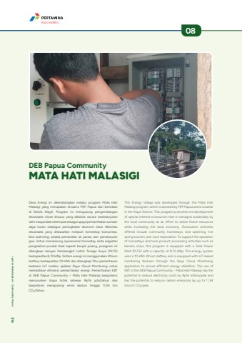 Desa Energi ini dikembangkan melalui program Mata Hati Malasigi yang merupakan binaana PEP Papua dan berlokasi di Distrik Klayili. Program ini mengusung pengembangan ekowisata minat khusus yang dikelola secara berkelanjutan oleh masyarakat setempat sebagai upaya pemanfaatan sumber daya hutan sekaligus peningkatan ekonomi lokal. Aktivitas ekowisata yang ditawarkan meliputi homestay komunitas, bird watching, wisata pemandian air panas, dan penelusuran goa. Untuk mendukung operasional homestay serta kegiatan pengolahan produk lokal seperti keripik pisang, praogram ini dilengkapi dengan Pembangkit Listrik Tenaga Surya (PLTS) berkapasitas 8,72 kWp. Sistem energi ini menggunakan lithium battery berkapasitas 10 kWh dan dilengkapi fitur pemantauan berbasis IoT melalui aplikasi Deye Cloud Monitoring untuk memastikan efisiensi pemanfaatan energi. Pemanfaatan EBT di DEB Papua Community %u2013 Mata Hati Malasigi berpotensi menurunkan biaya listrik sebesar Rp16 juta/tahun dan berpotensi mengurangi emisi karbon hingga 11,34 ton CO%u2082/tahun.This Energy Village was developed through the Mata Hati Malasigi program, which is assisted by PEP Papua and is located in the Klayili District. This program promotes the development of special interest ecotourism that is managed sustainably by the local community as an effort to utilize forest resources while increasing the local economy. Ecotourism activities offered include community homestays, bird watching, hot spring tourism, and cave exploration. To support the operation of homestays and local product processing activities such as banana chips, this program is equipped with a Solar Power Plant (PLTS) with a capacity of 8.72 kWp. This energy system uses a 10 kWh lithium battery and is equipped with IoT-based monitoring features through the Deye Cloud Monitoring application to ensure efficient energy utilization. The use of EBT in the DEB Papua Community - Mata Hati Malasigi has the potential to reduce electricity costs by Rp16 million/year and has the potential to reduce carbon emissions by up to 11.34 tons of CO%u2082/year.DEB Papua Community MATA HATI MALASIGI08HULU ENERGILaporan Keberlanjutan %u2022 Sustainability Report 314