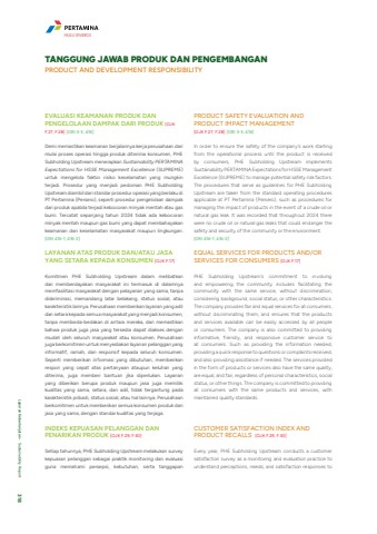 TANGGUNG JAWAB PRODUK DAN PENGEMBANGANPRODUCT AND DEVELOPMENT RESPONSIBILITYEVALUASI KEAMANAN PRODUK DAN PENGELOLAAN DAMPAK DARI PRODUK [OJK F.27, F.28] [GRI 3-3, 416] Demi memastikan keamanan berjalannya kerja perusahaan dari mulai proses operasi hingga produk diterima konsumen, PHE Subholding Upstream menerapkan Sustainability PERTAMINA Expectations for HSSE Management Excellence (SUPREME) untuk mengelola faktor risiko keselamatan yang mungkin terjadi. Prosedur yang menjadi pedoman PHE Subholding Upstream diambil dari standar prosedur operasi yang berlaku di PT Pertamina (Persero), seperti prosedur pengelolaan dampak dari produk apabila terjadi kebocoran minyak mentah atau gas bumi. Tercatat sepanjang tahun 2024 tidak ada kebocoran minyak mentah maupun gas bumi yang dapat membahayakan keamanan dan keselamatan masyarakat maupun lingkungan. [GRI 416-1, 416-2]LAYANAN ATAS PRODUK DAN/ATAU JASA YANG SETARA KEPADA KONSUMEN [OJK F.17]Komitmen PHE Subholding Upstream dalam melibatkan dan memberdayakan masyarakat ini termasuk di dalamnya memfasilitasi masyarakat dengan pelayanan yang sama, tanpa diskriminasi, memandang latar belakang, status sosial, atau karakteristik lainnya. Perusahaan memberikan layanan yang adil dan setara kepada semua masyarakat yang menjadi konsumen, tanpa membeda-bedakan di antara mereka, dan memastikan bahwa produk juga jasa yang tersedia dapat diakses dengan mudah oleh seluruh masyarakat atau konsumen. Perusahaan juga berkomitmen untuk menyediakan layanan pelanggan yang informatif, ramah, dan responsif kepada seluruh konsumen. Seperti memberikan informasi yang dibutuhan, memberikan respon yang cepat atas pertanyaan ataupun keluhan yang diterima, juga memberi bantuan jika diperlukan. Layanan yang diberikan berupa produk maupun jasa juga memiliki kualitas yang sama, setara, dan adil, tidak tergantung pada karakteristik pribadi, status sosial, atau hal lainnya. Perusahaan berkomitmen untuk memberikan semua konsumen produk dan jasa yang sama, dengan standar kualitas yang terjaga.INDEKS KEPUASAN PELANGGAN DAN PENARIKAN PRODUK [OJK F.29, F.30]Setiap tahunnya, PHE Subholding Upstream melakukan survey kepuasan pelanggan sebagai praktik monitoring dan evaluasi guna memahami persepsi, kebutuhan, serta tanggapan PRODUCT SAFETY EVALUATION AND PRODUCT IMPACT MANAGEMENT [OJK F.27, F.28] [GRI 3-3, 416] In order to ensure the safety of the company's work starting from the operational process until the product is received by consumers, PHE Subholding Upstream implements Sustainability PERTAMINA Expectations for HSSE Management Excellence (SUPREME) to manage potential safety risk factors. The procedures that serve as guidelines for PHE Subholding Upstream are taken from the standard operating procedures applicable at PT Pertamina (Persero), such as procedures for managing the impact of products in the event of a crude oil or natural gas leak. It was recorded that throughout 2024 there were no crude oil or natural gas leaks that could endanger the safety and security of the community or the environment. [GRI 416-1, 416-2]EQUAL SERVICES FOR PRODUCTS AND/OR SERVICES FOR CONSUMERS [OJK F.17]PHE Subholding Upstream's commitment to involving and empowering the community includes facilitating the community with the same service, without discrimination, considering background, social status, or other characteristics. The company provides fair and equal services for all consumers, without discriminating them, and ensures that the products and services available can be easily accessed by all people or consumers. The company is also committed to providing informative, friendly, and responsive customer service to all consumers. Such as providing the information needed, providing a quick response to questions or complaints received, and also providing assistance if needed. The services provided in the form of products or services also have the same quality, are equal, and fair, regardless of personal characteristics, social status, or other things. The company is committed to providing all consumers with the same products and services, with maintained quality standards.CUSTOMER SATISFACTION INDEX AND PRODUCT RECALLS [OJK F.29, F.30]Every year, PHE Subholding Upstream conducts a customer satisfaction survey as a monitoring and evaluation practice to understand perceptions, needs, and satisfaction responses to HULU ENERGILaporan Keberlanjutan %u2022 Sustainability Report 318