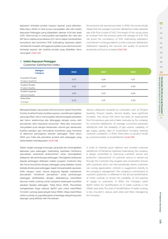 Indeks Kepuasan PelangganCustomer Satisfaction IndexKategoriCategory 2024 2023 2022Kuantitas ProdukProduct Quantity 4,57 4,46 4,31Kualitas ProdukProduct Quality 4,46 4,47 4,30Kualitas LayananService Quality 4,59 4,57 4,29Rata-RataAverage 4,54 4,51 4,30Berbagai kategori yang diulas oleh konsumen seperti Kuantitas Produk, Kualitas Produk, Kualitas Layanan, memiliki peningkatan yang signifikan. Hal ini menunjukkan bahwa terdapat perbaikan dari tahun sebelumnya dan ditanggapi dengan serius oleh perusahaan demi kepuasan konsumen. Rata-rata, konsumen menyatakan puas dengan kesesuaian volume gas, kesesuaian kualitas pasokan gas, kemudahan koordinasi yang termasuk di dalamnya penanganan keluhan pelanggan. Pada tahun 2024 pun tidak ada penarikan produk oleh pelanggan yang berlandaskan ketidakpuasan. [OJK F.29]Dalam rangka menjaga hubungan yang baik dan meningkatkan kepuasan para pelanggan Subholding Upstream Pertamina, perusahaan senantiasa berkomitmen untuk meningkatkan pelayanan dan perlindungan pelanggan. Peningkatan pelayanan kepada pelanggan dilakukan melalui program Customer Daydan forum koordinasi dengan pelanggan yang diadakan secara berkala dimana para pelanggan dapat menyampaikan apresiasi, kritik maupun saran secara langsung kepada manajemen perusahaan. Komitmen perusahaan untuk perlindungan pelanggan direfleksikan dengan dilakukannya resertifikasi tahunan meter custody untuk menjamin kesesuaian kuantitas pasokan kepada pelanggan. Pada tahun 2024, Perusahaan mengeluarkan biaya sebesar Rp501 juta untuk resertifikasi 12 meter custody pada wilayah kerja ONWJ. Biaya resertifikasi meter custody ini juga dikeluarkan di berbagai wilayah kerja dan lapangan yang dikelola oleh Perusahaan.Various categories reviewed by consumers such as Product Quantity, Product Quality, Service Quality, have significant increases. This shows that there has been an improvement from the previous year and is taken seriously by the company for consumer satisfaction. On average, consumers expressed satisfaction with the suitability of gas volume, suitability of gas supply quality, ease of coordination including handling customer complaints. In 2024, there were no product recalls by customers based on dissatisfaction. [OJK F.29]In order to maintain good relations and increase customer satisfaction of Pertamina Upstream Subholding, the company is always committed to improving customer service and protection. Improvement of customer service is carried out through the Customer Day program and coordination forums with customers which are held periodically where customers can convey appreciation, criticism or suggestions directly to the company's management. The company's commitment to customer protection is reflected in the annual recertification of meter custody to ensure the suitability of the quantity of supply to customers. In 2024, the Company spent Rp501 million for recertification of 12 meter custody in the ONWJ work area. The cost of recertification of meter custody is also incurred in various work areas and fields managed by the Company.kepuasan terhadap produk maupun layanan yang diberikan. Pada tahun 2024 ini hasil survey menyatakan rata-rata Indeks Kepuasan Pelanggan yang didapatkan sebesar 4,54 dari skala 5,00. Hasil survey ini menunjukkan peningkatan dari rata-rata IKP tahun sebelumnya sebesar 4,51. Hal ini dapat membuktikan konsistensi dari komitmen PHE Subholding Upstream dalam membenahi masalah sehingga pernyataan puas dari konsumen terhadap layanan dan kualitas produk yang dihasilkan terus meningkat. [OJK F.30]the products and services provided. In 2024, the survey results stated that the average Customer Satisfaction Index obtained was 4.54 from a scale of 5.00. The results of this survey show an increase from the previous year's IKP average of 4.51. This can prove the consistency of PHE Subholding Upstream's commitment to fixing problems so that consumer satisfaction statements regarding the services and quality of products produced continue to increase. [OJK F.30]01020304050607080910Generating Shared Value for the Community Menciptakan Nilai Bersama bagi Masyarakat11 PT Pertamina Hulu Energi 319