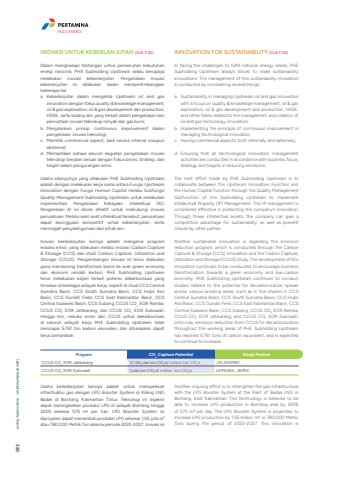 INOVASI UNTUK KEBERLANJUTAN [OJK F.26]Dalam menghadapi tantangan untuk pemenuhan kebutuhan energi nasional, PHE Subholding Upstream selalu berupaya melakukan inovasi keberlanjutan. Pengelolaan inovasi keberlanjutan ini dilakukan dalam mempertimbangkan beberapa hal:a. Keberlanjutan dalam mengelola Upstream oil and gas innovation dengan fokus quality & knowledge management, oil & gas exploration, oil & gas development dan production, HSSE, serta bidang lain yang terkait dalam pengelolaan dan penciptaan inovasi teknologi minyak dan gas bumi;b. Menjalankan prinsip continuous improvement dalam pengelolaan inovasi teknologi;c. Memiliki commercial aspect, baik secara internal maupun eksternal;d. Memastikan bahwa seluruh kegiatan pengelolaan inovasi teknologi berjalan sesuai dengan fokus bisnis, strategi, dan target dalam pengurangan emisi.Usaha selanjutnya yang dilakukan PHE Subholding Upstream adalah dengan melakukan kerja sama antara Fungsi Upstream Innovation dengan Fungsi Human Capital melalui Subfungsi Quality Management Subholding Upstream untuk melakukan implementasi Pengelolaan Kekayaan Intelektual (KI). Pengelolaan KI ini dinilai efektif untuk melindungi inovasi perusahaan. Melalui aset-aset intelektual tersebut, perusahaan dapat keunggulan kompetitif untuk keberlanjutan, serta mencegah penyalahgunaan dari pihak lain.Inovasi berkelanjutan lainnya adalah mengenai program reduksi emisi, yang dilakukan melalui inovasi Carbon Capture & Storage (CCS) dan studi Carbon Capture, Utilization and Storage (CCUS). Pengembangan inovasi ini terus dilakukan guna mendorong transformasi bisnis ke arah green economy dan ekonomi rendah karbon. PHE Subholding Upstream terus melakukan kajian terkait potensi dekarbonisasi yang tersebar di berbagai wilayah kerja, seperti di studi CCS Central Sumatra Basin, CCS South Sumatra Basin, CCS Hubs Asri Basin, CCS Gundih Field, CCS East Kalimantan Basin, CCS Central Sulawesi Basin, CCS Subang, CCUS CO2 EOR Ramba, CCUS CO2 EOR Jatibarang, dan CCUS CO2 EOR Sukowati. Hingga kini, reduksi emisi dari CCUS untuk dekarbonisasi di seluruh wilayah kerja PHE Subholding Upstream telah mencapai 5.761 ton karbon ekuivalen, dan diharapkan dapat terus bertambah.INNOVATION FOR SUSTAINABILITY [OJK F.26]In facing the challenges to fulfill national energy needs, PHE Subholding Upstream always strives to make sustainability innovations. The management of this sustainability innovation is conducted by considering several things:a. Sustainability in managing Upstream oil and gas innovation with a focus on quality & knowledge management, oil & gas exploration, oil & gas development and production, HSSE, and other fields related to the management and creation of oil and gas technology innovation;b. Implementing the principle of continuous improvement in managing technological innovation;c. Having commercial aspects, both internally and externally;d. Ensuring that all technological innovation management activities are conducted in accordance with business focus, strategy and targets in reducing emissions.The next effort made by PHE Subholding Upstream is to collaborate between the Upstream Innovation Function and the Human Capital Function through the Quality Management Subfunction of the Subholding Upstream to implement Intellectual Property (IP) Management. This IP management is considered effective in protecting the company's innovation. Through these intellectual assets, the company can gain a competitive advantage for sustainability, as well as prevent misuse by other parties.Another sustainable innovation is regarding the emission reduction program, which is conducted through the Carbon Capture & Storage (CCS) innovation and the Carbon Capture, Utilization and Storage (CCUS) study. The development of this innovation continues to be conducted to encourage business transformation towards a green economy and low-carbon economy. PHE Subholding Upstream continues to conduct studies related to the potential for decarbonization spread across various working areas, such as in the studies in CCS Central Sumatra Basin, CCS South Sumatra Basin, CCS Hubs Asri Basin, CCS Gundih Field, CCS East Kalimantan Basin, CCS Central Sulawesi Basin, CCS Subang, CCUS CO2 EOR Ramba, CCUS CO2 EOR Jatibarang, and CCUS CO2 EOR Sukowati. Until now, emission reduction from CCUS for decarbonization throughout the working areas of PHE Subholding Upstream has reached 5,761 tons of carbon equivalent, and is expected to continue to increase.Program CO2 Capture Potential Study PartnerCCUS CO2 EOR Jatibarang 0.146 juta ton CO2e/ million ton CO2e JX/JOGMECCCUS CO2 EOR Sukowati 1 juta ton CO2e/ million ton CO2e LEMIGAS, JAPEXUsaha berkelanjutan lainnya adalah untuk memperkuat infrastruktur gas dengan LPG Booster System di Kilang LNG Badak di Bontang, Kalimantan Timur. Teknologi ini diyakini dapat meningkatkan produksi LPG di wilayah Bontang hingga 323% sebesar 575 m3 per hari. LPG Booster System ini diproyeksi dapat menambah produksi LPG sebesar 1,56 juta m3atau 780.000 Metrik Ton selama periode 2022-2027. Inovasi ini Another ongoing effort is to strengthen the gas infrastructure with the LPG Booster System at the Plant of Badak LNG in Bontang, East Kalimantan. This technology is believed to be able to increase LPG production in Bontang area by 323% of 575 m3 per day. The LPG Booster System is projected to increase LPG production by 1.56 million m3 or 780,000 Metric Tons during the period of 2022-2027. This innovation is HULU ENERGILaporan Keberlanjutan %u2022 Sustainability Report 320