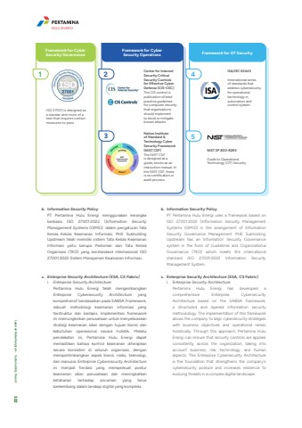 Framework for Cyber Security Governance Framework for OT Security Framework for Cyber Security OperationsISO 27001 is designed as a standar and more of a test that requires certain measures to passCenter for Internet Security Critical Security Controls for Effective Cyber Defense (CIS-CSC)The CIS control is publication of best practice guidelines for computer security that organizations should implement to block or mitigate known attacksISA/IEC 62443International series of standards that address cybersecurity for operational technology in automation and control systemNIST SP 800-82R3Guide to Operational Technology (OT) SecurityNation Institute of Standard & Technology Cyber Security Framework (NIST CSF)The NIST CSF is designed as a guide, serves as an instruction manual. In the NIST CSF, there is no certification or audit process.1 2 43 5b. Information Security PolicyPT Pertamina Hulu Energi menggunakan kerangka berbasis ISO 27001:2022 (Information Security Management Systems (ISMS)) dalam pengaturan Tata Kelola Kelola Keamanan Informasi. PHE Subholding Upstream telah memiliki sistem Tata Kelola Keamanan Informasi yaitu berupa Pedoman dan Tata Kelola Organisasi (TKO) yang berstandard internasional ISO 27001:2022 Sistem Manajemen Keamanan Informasi. c. Enterprise Security Architecture (ESA, CS Fabric)i. Enterprise Security ArchitecturePertamina Hulu Energi telah mengembangkan Enterprise Cybersecurity Architecture yang komprehensif berdasarkan pada SABSA Framework, sebuah metodologi keamanan informasi yang terstruktur dan berlapis. Implementasi frameworkini memungkinkan perusahaan untuk menyelaraskan strategi keamanan siber dengan tujuan bisnis dan kebutuhan operasional secara holistik. Melalui pendekatan ini, Pertamina Hulu Energi dapat memastikan bahwa kontrol keamanan diterapkan secara konsisten di seluruh organisasi, dengan mempertimbangkan aspek bisnis, risiko, teknologi, dan manusia. Enterprise Cybersecurity Architectureini menjadi fondasi yang memperkuat postur keamanan siber perusahaan dan meningkatkan ketahanan terhadap ancaman yang terus berkembang dalam lanskap digital yang kompleks.b. Information Security PolicyPT Pertamina Hulu Energi uses a framework based on ISO 27001:2022 (Information Security Management Systems (ISMS)) in the arrangement of Information Security Governance Management. PHE Subholding Upstream has an Information Security Governance system in the form of Guidelines and Organizational Governance (TKO) which meets the international standard ISO 27001:2022 Information Security Management System.c. Enterprise Security Architecture (ESA, CS Fabric)i. Enterprise Security ArchitecturePertamina Hulu Energi has developed a comprehensive Enterprise Cybersecurity Architecture based on the SABSA Framework, a structured and layered information security methodology. The implementation of this framework allows the company to align cybersecurity strategies with business objectives and operational needs holistically. Through this approach, Pertamina Hulu Energi can ensure that security controls are applied consistently across the organization, taking into account business, risk, technology, and human aspects. This Enterprise Cybersecurity Architecture is the foundation that strengthens the company's cybersecurity posture and increases resilience to evolving threats in a complex digital landscape.HULU ENERGILaporan Keberlanjutan %u2022 Sustainability Report 322