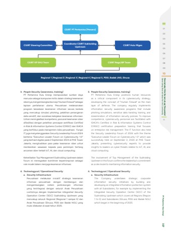 CSIRT PT Pertamina (Persero)CSIRT Steering Committee Coordinator CSIRT Subholding Upstream CSIRT Hulu MigasCSIRT KP SHU Team CSIRT Regs/AP TeamRegional 1 | Regional 2 | Regional 3 | Regional 4 | Regional 5, PDSI, Badak LNG, Elnusa3. People Security (awareness, training)PT Pertamina Hulu Energi memposisikan sumber daya manusia sebagai komponen kritis dalam strategi keamanan sibernya, mengembangkan konsep %u201cHuman Firewall%u201d sebagai lapisan pertahanan utama. Perusahaan melaksanakan program kesadaran keamanan informasi secara berkala yang mencakup simulasi phishing, pelatihan penanganan data sensitif, dan sosialisasi kebijakan keamanan informasi. Untuk meningkatkan kompetensi, personel keamanan siber difasilitasi dengan pelatihan persiapan sertifikasi Certified in Risk & Information Systems Control (CRISC) dari ISACA yang berfokus pada manajemen risiko perusahaan. Fungsi IT juga menyelenggarakan Security Leadership Forum 2024 bertema %u201cExecutive Leader Forum on Cybersecurity 1.0%u201d yang berhasil digelar pada 2 September 2024 di PHE Tower Jakarta, menghadirkan para pakar keamanan siber untuk memberikan wawasan kepada para pemimpin tentang ancaman siber terkait IoT, AI, dan cloud computing.Keterlibatan Top Management Subholding Upstream dalam forum ini menegaskan komitmen kepemimpinan sebagai role model dalam menjaga keamanan informasi. 4. Technologycal / Operational Securitya. Security InfrastructurePerusahaan melakukan inisiatif strategis keamanan informasi perusahaan dengan membangun dan mengembangkan sistem perlindungan informasi yang terintegrasi dengan seluruh Anak Perusahaan contohnya dengan Implementasi Integrated Security Operation Center (SOC) Subholding Upstream yang mencakup seluruh Regional (Regional 1 sampai 5) dan Anak Perusahaan (Elnusa, PDSI dan Badak NGL) yang mulai dilakukan di awal tahun 2025.3. People Security (awareness, training)PT Pertamina Hulu Energi positions human resources as a critical component in its cybersecurity strategy, developing the concept of \layer of defense. The company regularly implements information security awareness programs that include phishing simulations, sensitive data handling training, and dissemination of information security policies. To improve competence, cybersecurity personnel are facilitated with ISACA's Certified in Risk & Information Systems Control (CRISC) certification preparation training that focuses on enterprise risk management. The IT function also held the Security Leadership Forum of 2024 with the theme \successfully held on September 2, 2024 at PHE Tower Jakarta, presenting cybersecurity experts to provide insights to leaders on cyber threats related to IoT, AI, and cloud computing.The involvement of Top Management of the Subholding Upstream in this forum confirms the leadership's commitment as a role model to maintaining information security.4. Technologycal / Operational Securitya. Security InfrastructureThe Company undertakes strategic corporate information security initiatives by building and developing an integrated information protection system with all Subsidiaries, for example by implementing the Integrated Security Operation Center (SOC) of the Subholding Upstream which covers all Regions (Region 1 to 5) and Subsidiaries (Elnusa, PDSI and Badak NGL) which began in the beginning of 2025.01020304050607080910Generating Shared Value for the Community Menciptakan Nilai Bersama bagi Masyarakat11 PT Pertamina Hulu Energi 327