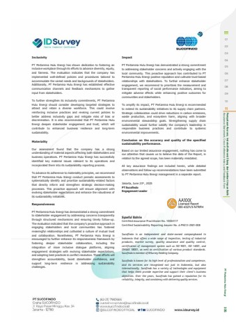 InclusivityPT Pertamina Hulu Energi has shown dedication to fostering an inclusive workplace through its efforts to advance diversity, equity, and fairness. The evaluation indicates that the company has implemented well-defined policies and procedures tailored to accommodate the varied needs and backgrounds of stakeholders. Additionally, PT Pertamina Hulu Energi has established effective communication channels and feedback mechanisms to gather input from stakeholders.To further strengthen its inclusivity commitments, PT Pertamina Hulu Energi should consider developing targeted strategies to attract and retain a diverse workforce. This could involve reinforcing inclusive practices and revising current policies to better address inclusivity gaps and mitigate risks of bias or discrimination. It is also recommended that PT Pertamina Hulu Energi deepen stakeholder engagement and trust, which will contribute to enhanced business resilience and long-term sustainability.MaterialityOur assessment found that the company has a strong understanding of material aspects affecting both stakeholders and business operations. PT Pertamina Hulu Energi has successfully identified key material issues relevant to its operations and incorporated them into its sustainability reporting process.To advance its adherence to materiality principles, we recommend that PT Pertamina Hulu Energi conduct periodic assessments to systematically identify and prioritize sustainability-related factors that directly inform and strengthen strategic decision-making processes. This proactive approach will ensure alignment with evolving stakeholder expectations and enhance the robustness of its sustainability initiatives.ResponsivenessPT Pertamina Hulu Energi has demonstrated a strong commitment to stakeholder engagement by addressing concerns transparently through structured mechanisms and ensuring timely follow-up. The evaluation indicated that the company%u2019s proactive approach in engaging stakeholders and local communities has fostered meaningful relationships and cultivated a culture of mutual trust and collaboration. Nonetheless, PT Pertamina Hulu Energi is encouraged to further enhance its responsiveness framework by fostering deeper stakeholder collaboration, including the integration of more inclusive dialogue platforms, aligning engagement strategies with evolving stakeholder expectations, and adopting best practices in conflict resolution. These efforts will strengthen accountability, boost stakeholder confidence, and support long-term resilience in addressing sustainability challenges. Impact PT Pertamina Hulu Energi has demonstrated a strong commitment to addressing stakeholder concerns and actively engaging with the local community. This proactive approach has contributed to PT Pertamina Hulu Energi positive reputation and cultivate trust-based relationships with stakeholders. To further enhance stakeholder engagement, we recommend to prioritizes the measurement and transparent reporting of social performance indicators, aiming to mitigate adverse effects while enhancing positive outcomes for communities and stakeholders. To amplify its impact, PT Pertamina Hulu Energi is recommended to extend its sustainability initiatives to its supply chain partners. Strategic collaboration could drive reductions in carbon emissions, waste production, and ecosystem harm, aligning with broader environmental stewardship goals. Strengthening supply chain sustainability would further solidify the company%u2019s leadership in responsible business practices and contribute to systemic environmental improvements. Conclusion on the accuracy and quality of the specified sustainability performance. Based on our limited assurance engagement, nothing has come to our attention that causes us to believe the data of the Report, in relation to the agreed scope, has been materially misstated. All key assurance findings are included herein, while detailed observations and follow-up recommendations have been submitted to PT Pertamina Hulu Energi management in a separate report. Jakarta, June 23th, 2025 PT Sucofindo Engagement LeaderSyaeful BahrieCertified Assurance Practitioner No. 10024117Certified Sustainability Reporting Assurer No. A-PK213-2501-008Sucofindo is an independent and state-owned companybased in Indonesia that offers a wide range of inspection, testing of industrial products, marine survey, quality assurance and quality control, certification of management system such as ISO 9001, ISO 14001, and OHSAS 18001, as well as certification of various product standards. Sucofindo is member of IDSurvey Holding Company.Sucofindo is known for its high level of professionalism and competence, and its services are recognized not just in Indonesia, but also internationally. Sucofindo has a variety of technologies and equipment that helps them provide expertise and support their client%u2019s business objectives. Over the years, Sucofindo has gained a reputation for its reliability, integrity, and consistency with delivering quality services.0102030405060708091011 Assurance Statement, Cross-Reference Index, and Feedback Form Pernyataan Asurans, Indeks Referensi Silang dan Lembar Umpan Balik PT Pertamina Hulu Energi 335
