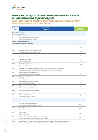 No Indeks IndexNama IndeksIndex Title HalamanPage NumberStrategi KeberlanjutanSustainability StrategyA.1 Penjelasan Strategi KeberlanjutanAbout the Sustainability Strategy 67-72Ikhtisar Kinerja KeberlanjutanSustainability Performance Overview B.1 Ikhtisar Kinerja EkonomiEconomic Performance Overview 6, 149B.1.a Kuantitas Produksi atau Jasa yang Dijual Quantity of Production or Service sold 6B.1.b Pendapatan atau Penjualan Revenue or Sales6B.1.c Laba atau Rugi Bersih Net profit or net loss6B.1.d Produk Ramah LingkunganEco friendly Product 6, 148B.1.e Pelibatan Pihak Lokal yang Berkaitan dengan Proses Bisnis Keuangan BerkelanjutanInvolvement of Local Parties Related to Sustainable Finance Business Processes6B.2 Ikhtisar Kinerja Lingkungan HidupEnvironmental Performance Overview7B.2.a Penggunaan Energi Use of Energy 7B.2.b Pengurangan Emisi yang Dihasilkan Reducing Produced Emission7B.2.c Pengurangan Limbah dan Efluen Reducing Waste and Effluent7B.2.d Pelestarian Keanekaragaman Hayati Preservation of Biodiversity7B.3 Ikhtisar Kinerja Sosial Social Performance Overview8Profil PerusahaanCompany ProfileC.1 Visi, Misi, dan Nilai KeberlanjutanVision, Mission, and Sustainability Value 84-85C.2 Alamat PerusahaanCompany Address 80C.3 Skala UsahaScale of Business 96C.3.a Total Aset atau Kapitalisasi Aset, dan Total KewajibanTotal Asset or Asset Capitalization, and Total Liabilities 96C.3.b Jumlah Pekerja Menurut Jenis Kelamin, Jabatan, Usia, Pendidikan, dan Status KetenagakerjaanNumber of Employees According to Gender, Position, Age, Education, and Citizenship 97-99INDEKS SEOJK 16/2021 SESUAI PERATURAN OTORITAS JASA KEUANGAN NOMOR 51/POJK.03/2017SEOJK INDEX 16/2021 IN ACCORDANCE WITH FINANCIAL SERVICES AUTHORITY REGULATION NUMBER 51/POJK.03/2017 [OJK G.4]HULU ENERGILaporan Keberlanjutan %u2022 Sustainability Report 336