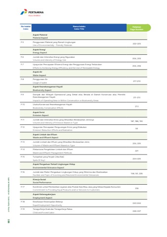 No Indeks IndexNama IndeksIndex Title HalamanPage NumberAspek MaterialMaterial Aspect F.5 Penggunaan Material yang Ramah LingkunganUse of Environmentally - Friendly Materials 222-223Aspek Energi Energy Aspect F.6 Jumlah dan Intensitas Energi yang Digunakan Volume and Intensity of Energy Use 204, 205F.7 Upaya dan Pencapaian Efisiensi Energi dan Penggunaan Energi Terbarukan Efforts to Achieving Energy Efficiency and the Use of Renewable Energy 204, 206Aspek Air Water AspectF.8 Penggunaan Air Usage of water217-219Aspek Keanekaragaman Hayati Biodiversity Aspect F.9 Dampak dari Wilayah Operasional yang Dekat atau Berada di Daerah Konservasi atau Memiliki Keanekaragaman Hayati Impacts of Operating Near or Within Conservation or Biodiversity Areas211-213F.10 Usaha Konservasi Keanekaragaman Hayati Biodiversity Conservation Efforts213Aspek Emisi Emission Aspect F.11 Jumlah dan Intensitas Emisi yang Dihasilkan Berdasarkan Jenisnya Volume and Intensity of Emission Based on Type 187, 188, 190F.12 Upaya dan Pencapaian Pengurangan Emisi yang Dilakukan Emission Reduction Efforts and Realization 191Aspek Limbah dan EfluenWaste and Effluent Aspect F.13 Jumlah Limbah dan Efluen yang Dihasilkan Berdasarkan Jenis Volume of Waste and Effluent Based on Type 224, 225F.14 Mekanisme Pengelolaan Limbah dan Efluen Waste and Effluent Management Methods221F.15 Tumpahan yang Terjadi (Jika Ada) Spills (If Any) 224-225Aspek Pengaduan Terkait Lingkungan Hidup Environmental Grievance AspectF.16 Jumlah dan Materi Pengaduan Lingkungan Hidup yang Diterima dan Diselesaikan Number and Topic of Incoming and Resolved Environmental Grievances 158, 161, 226Kinerja Sosial Social Performance F.17 Komitmen untuk Memberikan Layanan atas Produk Dan/Atau Jasa yang Setara Kepada Konsumen Commitment to Providing Equal Products and/ or Services to Customers318Aspek Ketenagakerjaan Employment Aspect F.18 Kesetaraan Kesempatan Bekerja Equal Employment Opportunity 243-244F.19 Tenaga Kerja Anak dan Tenaga Kerja Paksa Child and Forced Labor 246-247HULU ENERGILaporan Keberlanjutan %u2022 Sustainability Report 338