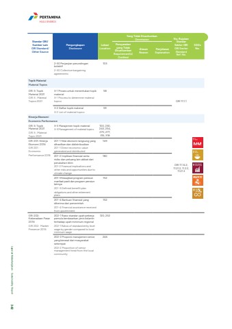 Standar GRI/Sumber LainGRI Standard/ Other Source PengungkapanDisclosure LokasiLocationYang Tidak DicantumkanOmmission No. Rujukan Standar Sektor GRIGRI Sector Standard Ref. No.SDGs No.Persyaratan yang Tidak DicantumkanRequirement(s) Omitted AlasanReasonPenjelasanExplanation2-30 Perjanjian perundingan kolektif2-30 Collective bargaining agreements 103Topik MaterialMaterial TopicsGRI 3: Topik Material 2021GRI 3 : Material Topics 20213-1 Proses untuk menentukan topik material3-1 Process to determine material topics 58GRI 11.1.13-2 Daftar topik material3-2 List of material topics 59Kinerja Ekonomi Economic PerformanceGRI 3: Topik Material 2021GRI 3 : Material Topic 20213-3 Manajemen topik material3-3 Management of material topics 100, 230, 243, 254, 270, 277, 316, 318GRI 11.14.2, 11.21.2, 11.2.2, 11.21.3GRI 201: Kinerja Ekonomi 2016GRI 201 : EconomicPerformance 2016201-1 Nilai ekonomi langsung yang dihasilkan dan didistribusikan201-1 Direct economic value generated and distributed 149201-2 Implikasi finansial serta risiko dan peluang lain akibat dari perubahan iklim201-2 Financial implications and other risks and opportunities due to climate change 180201-3 Kewajiban program pensiun manfaat pasti dan program pensiun lainnya201-3 Defined benefit plan obligations and other retirement plans 152201-4 Bantuan finansial yang diterima dari pemerintah201-4 Financial assistance received from government 152GRI 202: Keberadaan Pasar 2016GRI 202: Market Presence 2016202-1 Rasio standar upah pekerja pemula berdasarkan jenis kelamin terhadap upah minimum regional202-1 Ratios of standard entry level wage by gender compared to local minimum wage120, 252 202-2 Proporsi manajemen senior yang berasal dari masyarakat setempat202-2 Proportion of senior management hired from the local community246HULU ENERGILaporan Keberlanjutan %u2022 Sustainability Report 342