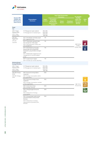Standar GRI/Sumber LainGRI Standard/ Other Source PengungkapanDisclosure LokasiLocationYang Tidak DicantumkanOmmission No. Rujukan Standar Sektor GRIGRI Sector Standard Ref. No.SDGs No.Persyaratan yang Tidak DicantumkanRequirement(s) Omitted AlasanReasonPenjelasanExplanationPajakTaxGRI 3: Topik Material 2021GRI 3: Topic Material 20213-3 Manajemen topik material3-3 Management of material topics 100, 230, 243, 254, 270, 277, 316, 318GRI 11.21.4, 11.21.5, 11.21.6, 11.21.7GRI 207: Pajak 2019GRI 207 : Tax 2019 207-1 Pendekatan terhadap pajak207-1 Approach to tax151207-2 Tata kelola, pengontrolan, dan manajemen risiko pajak207-2 Tax governance, control, and risk management151207-3 Keterlibatan pemangku kepentingan dan pengelolaan kepedulian yang berkaitan dengan pajak207-3 Stakeholder engagement and management of concerns related to tax151207-4 Laporan per negara207-4 Country-by-country reporting151Efisiensi EnergiEnergy EfficiencyGRI 3: Topik Material 2021GRI 3: Topic Material 20213-3 Manajemen topik material3-3 Management of material topics 100, 230, 243, 254, 270, 277, 316, 318GRI 11.1.2, 11.1.3, 11.1.4GRI 302: Energi 2016GRI 302 : Energy 2016 302-1 Konsumsi energi dalam organisasi302-1 Energy consumption within the organization 204302-2 Konsumsi energi di luar organisasi302-2 Energy consumption outside of the organization 204302-3 Intensitas energi302-3 Energy intensity205302-4 Pengurangan konsumsi energi302-4 Reduction of energy consumption 206302-5 Pengurangan pada energi yang dibutuhkan untuk produk dan jasa302-5 Reductions in energy requirements of products and services 206HULU ENERGILaporan Keberlanjutan %u2022 Sustainability Report 344