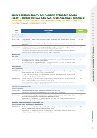 INDEKS SUSTAINABILITY ACCOUNTING STANDARD BOARD (SASB) %u2013 SEKTOR MINYAK DAN GAS: EKSPLORASI DAN PRODUKSI SUSTAINABILITY ACCOUNTING STANDARD BOARD (SASB) - OIL AND GAS SECTOR: EXPLORATION AND PRODUCTION INDEXKode CodePengungkapan DisclosureHalaman Page NumberEmisi Gas Rumah KacaGreenhouse Gas EmissionsEM-EP-110a.1 Emisi Cakupan 1 global bruto, persentase metana, persentase yang tercakup dalam peraturan pembatasan emisi.Gross global Scope 1 emissions, percentage methane, percentage covered under emissions-limiting regulations.187, 188EM-EP-110a.3 Pembahasan strategi atau rencana jangka panjang dan jangka pendek untuk mengelola Scope 1 emisi, target penurunan emisi, dan analisis kinerja terhadap target tersebut.Discussion of long-term and short-term strategy or plan to manage Scope 1 emissions, emissions reduction targets, and an analysis of performance against those targets.191Kualitas UdaraAir QualityEM-EP-120a.1 Emisi udara dari polutan berikut: (1) NOx (tidak termasuk N2O), (2) SOx, (3) senyawa organik yang mudah menguap (VOC), dan (4) partikel (PM10).Air Emissions from the Following Pollutants: (1) NOx (excluding N2O), (2) SOx, (3) Volatile Organic Compounds (VOC), and (4) Particulate Matter (PM10).187Manajemen AirWater ManagementEM-EP-140a.1 (1) Jumlah air bersih yang diambil, (2) jumlah air bersih yang dikonsumsi, persentase masing-masing di daerah dengan Stres Air Dasar Tinggi atau Sangat Tinggi.(1) Total clean water extracted, (2) total clean water consumed, and the percentage of each in areas with high or very high baseline water stress.217EM-EP-140a.2 Volume air terproduksi dan aliran balik yang dibangkitkan; persentase (1) habis, (2) disuntikkan, (3) didaur ulang; kandungan hidrokarbon dalam pembuangan air.Volume of produced water and flowback generated; percentage (1) discharged, (2) injected, (3) recycled; hydrocarbon content in discharged water.218Dampak Keanekaragaman HayatiBiodiversity ImpactsEM-EP-160a.1 Deskripsi kebijakan dan praktik manajemen lingkungan untuk aktif situs.Description of environmental management policies and practices for active sites.162, 166, 213EM-EP-160a.3 Persentase dari (1) cadangan terbukti dan (2) terduga di dalam atau dekat lokasi dengan status konservasi yang dilindungi atau habitat spesies yang terancam punah.Percentage of (1) proved and (2) probable reserves in or near sites with protected conservation status or endangered species habitat.214Keamanan, Hak Asasi Manusia dan Hak Masyarakat AdatSecurity, Human Rights, and Indigenous Peoples' RightsEM-EP-210a.3 Pembahasan proses keterlibatan dan praktik uji tuntas dengan penghormatan terhadap hak asasi manusia, hak masyarakat adat, dan operasi di wilayah konflikDiscussion of the engagement process and due diligence practices with respect to human rights, indigenous peoples' rights, and operations in conflict areas.3160102030405060708091011 Assurance Statement, Cross-Reference Index, and Feedback Form Pernyataan Asurans, Indeks Referensi Silang dan Lembar Umpan Balik PT Pertamina Hulu Energi 351