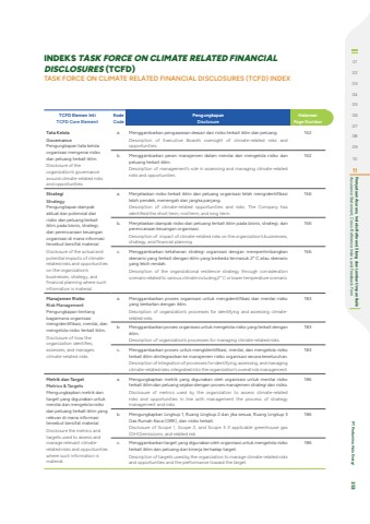 INDEKS TASK FORCE ON CLIMATE RELATED FINANCIAL DISCLOSURES (TCFD) TASK FORCE ON CLIMATE RELATED FINANCIAL DISCLOSURES (TCFD) INDEXTCFD Elemen IntiTCFD Core ElementKodeCodePengungkapanDisclosureHalamanPage NumberTata KelolaGovernancePengungkapan tata kelola organisasi mengenai risiko dan peluang terkait iklim. Disclosure of the organization%u2019s governance around climate-related risks and opportunities.a. Menggambarkan pengawasan dewan dari risiko terkait iklim dan peluang.Description of Executive Board%u2019s oversight of climate-related risks and opportunities.162b. Menggambarkan peran manajemen dalam menilai dan mengelola risiko dan peluang terkait iklim.Description of management%u2019s role in assessing and managing climate-related risks and opportunities.162StrategiStrategyPengungkapan dampak aktual dan potensial dari risiko dan peluang terkait iklim pada bisnis, strategi, dan perencanaan keuangan organisasi di mana informasi tersebut bersifat material.Disclosure of the actual and potential impacts of climaterelated risks and opportunities on the organization%u2019s businesses, strategy, and financial planning where such information is material.a. Menjelaskan risiko terkait iklim dan peluang organisasi telah mengidentifikasi lebih pendek, menengah dan jangka panjang.Description of climate-related opportunities and risks. The Company has identified the short term, mid term, and long term. 166b. Menjelaskan dampak risiko dan peluang terkait iklim pada bisnis, strategi, dan perencanaan keuangan organisasi.Description of impact of climate-related risks on the organization%u2019s businesses, strategy, and financial planning.166c. Menggambarkan ketahanan strategi organisasi dengan mempertimbangkan skenario yang terkait dengan iklim yang berbeda termasuk 2%u00b0 C atau skenario yang lebih rendah.Description of the organizational resilience strategy through consideration scenario related to various climate including 2%u00b0 C or lower temperature scenario.166Manajemen RisikoRisk ManagementPengungkapan tentang bagaimana organisasi mengidentifikasi, menilai, dan mengelola risiko terkait iklim.Disclosure of how the organization identifies, assesses, and manages climate-related risks.a. Menggambarkan proses organisasi untuk mengidentifikasi dan menilai risiko yang berkaitan dengan iklim.Description of organization%u2019s processes for identifying and assessing climaterelated risks.183b. Menggambarkan proses organisasi untuk mengelola risiko yang terkait dengan iklim.Description of organization%u2019s processes for managing climate-related risks.183c. Menggambarkan proses untuk mengidentifikasi, menilai, dan mengelola risiko terkait iklim diintegrasikan ke manajemen risiko organisasi secara keseluruhan.Description of integration of processes for identifying, assessing, and managing climate-related risks integrated into the organization%u2019s overall risk management.183Metrik dan TargetMetrics & TargetsMengungkapkan metrik dan target yang digunakan untuk menilai dan mengelola risiko dan peluang terkait iklim yang relevan di mana informasi tersebut bersifat material.Disclosure the metrics and targets used to assess and manage relevant climaterelated risks and opportunities where such information is material.a. Mengungkapkan metrik yang digunakan oleh organisasi untuk menilai risiko terkait iklim dan peluang sejalan dengan proses manajemen strategi dan risiko.Disclosure of metrics used by the organization to assess climate-related risks and opportunities in line with management the process of strategy management and risks.186b. Mengungkapkan Lingkup 1, Ruang Lingkup 2 dan jika sesuai, Ruang Lingkup 3 Gas Rumah Kaca (GRK), dan risiko terkait.Disclosure of Scope 1, Scope 2, and Scope 3 if applicable greenhouse gas (GHG)emissions, and related risk.186c. Menggambarkan target yang digunakan oleh organisasi untuk mengelola risiko terkait iklim dan peluang dan kinerja terhadap target.Description of targets used by the organization to manage climate-related risks and opportunities and the performance toward the target.1860102030405060708091011 Assurance Statement, Cross-Reference Index, and Feedback Form Pernyataan Asurans, Indeks Referensi Silang dan Lembar Umpan Balik PT Pertamina Hulu Energi 353