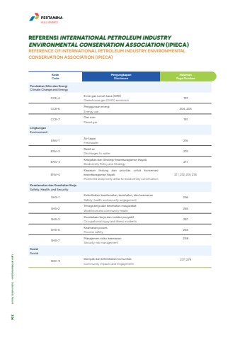 REFERENSI INTERNATIONAL PETROLEUM INDUSTRY ENVIRONMENTAL CONSERVATION ASSOCIATION (IPIECA)REFERENCE OF INTERNATIONAL PETROLEUM INDUSTRY ENVIRONMENTAL CONSERVATION ASSOCIATION (IPIECA) KodeCodePengungkapanDisclosureHalamanPage NumberPerubahan Iklim dan EnergiClimate Change and EnergyCCE-4 Emisi gas rumah kaca (GRK)Greenhouse gas (GHG) emissions 191CCE-6 Penggunaan energiEnergy use 204, 205CCE-7Gas suarFlared gas191LingkunganEnvironmentENV-1Air tawarFreshwater216ENV-2Debit airDischarges to water215ENV-3 Kebijakan dan Strategi Keanekaragaman HayatiBiodiversity Policy and Strategy211ENV-4Kawasan lindung dan prioritas untuk konservasi keanekaragaman hayatiProtected and priority areas for biodiversity conservation211, 212, 213, 214Keselamatan dan Kesehatan KerjaSafety, Health, and SecuritySHS-1 Keterlibatan keselamatan, kesehatan, dan keamananSafety, health and security engagement256SHS-2 Tenaga kerja dan kesehatan masyarakatWorkforce and community health265SHS-3 Kecelakaan kerja dan insiden penyakitOccupational injury and illness incidents261SHS-6 Keamanan prosesProcess safety263SHS-7 Manajemen risiko keamananSecurity risk management258SosialSocialSOC-9 Dampak dan keterlibatan komunitasCommunity impacts and engagement277, 279HULU ENERGILaporan Keberlanjutan %u2022 Sustainability Report 354