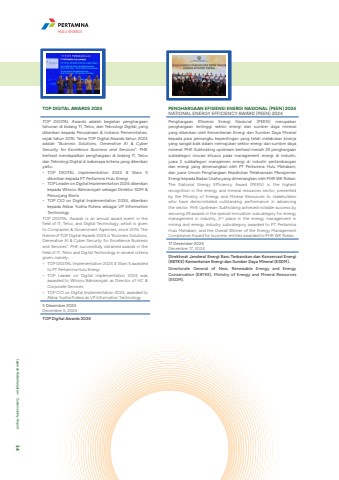 TOP DIGITAL AWARDS 2024TOP DIGITAL Awards adalah kegiatan penghargaan tahunan di bidang TI, Telco, dan Teknologi Digital, yang diberikan kepada Perusahaan & Instansi Pemerintahan, sejak tahun 2016. Tema TOP Digital Awards tahun 2024 adalah %u201cBusiness Solutions, Generative AI & Cyber Security for Excellence Business and Services%u201d. PHE berhasil mendapatkan penghargaan di bidang IT, Telco dan Teknologi Digital di beberapa kriteria yang diberikan yaitu: %u2022 TOP DIGITAL Implementation 2024 # Stars 5 diberikan kepada PT Pertamina Hulu Energi%u2022 TOP Leader on Digital Implementation 2024 diberikan kepada Whisnu Bahriansyah sebagai Direktur SDM & Penunjang Bisnis %u2022 TOP CIO on Digital Implementation 2024, diberikan kepada Akbar Yudha Putera sebagai VP Information TechnologyTOP DIGITAL Awards is an annual award event in the field of IT, Telco, and Digital Technology, which is given to Companies & Government Agencies, since 2016. The theme of TOP Digital Awards 2024 is %u201cBusiness Solutions, Generative AI & Cyber Security for Excellence Business and Services%u201d. PHE successfully obtained awards in the field of IT, Telco and Digital Technology in several criteria given, namely:%u2022 TOP DIGITAL Implementation 2024 # Stars 5 awarded to PT Pertamina Hulu Energi%u2022 TOP Leader on Digital Implementation 2024 was awarded to Whisnu Bahriansyah as Director of HC & Corporate Services%u2022 TOP CIO on Digital Implementation 2024, awarded to Akbar Yudha Putera as VP Information Technology5 Desember 2024December 5, 2024TOP Digital Awards 2024PENGHARGAAN EFISIENSI ENERGI NASIONAL (PEEN) 2024NATIONAL ENERGY EFFICIENCY AWARD (PEEN) 2024Penghargaan Efisiensi Energi Nasional (PEEN) merupakan penghargaan tertinggi sektor energi dan sumber daya mineral yang diberikan oleh Kementerian Energi dan Sumber Daya Mineral kepada para pemangku kepentingan yang telah melakukan kinerja yang sangat baik dalam memajukan sektor energi dan sumber daya mineral. PHE Subholding upstream berhasil meraih 29 penghargaan subkategori inovasi khusus pada management energi di industri, juara 2 subkategori manajemen energi di industri pertambangan dan energi yang dimenangkan oleh PT Pertamina Hulu Mahakam, dan juara Umum Penghargaan Kepatuhan Pelaksanaan Manajemen Energi kepada Badan Usaha yang dimenangkan oleh PHR WK Rokan.The National Energy Efficiency Award (PEEN) is the highest recognition in the energy and mineral resources sector, presented by the Ministry of Energy and Mineral Resources to stakeholders who have demonstrated outstanding performance in advancing the sector. PHE Upstream Subholding achieved notable success by securing 29 awards in the special innovation subcategory for energy management in industry, 2nd place in the energy management in mining and energy industry subcategory awarded to PT Pertamina Hulu Mahakam, and the Overall Winner of the Energy Management Compliance Award for business entities awarded to PHR WK Rokan.17 Desember 2024December 17, 2024Direktorat Jenderal Energi Baru Terbarukan dan Konservasi Energi (EBTKE) Kementerian Energi dan Sumber Daya Mineral (ESDM).Directorate General of New, Renewable Energy and Energy Conservation (EBTKE), Ministry of Energy and Mineral Resources (ESDM).HULU ENERGILaporan Keberlanjutan %u2022 Sustainability Report 34