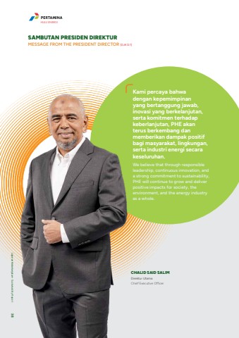 CHALID SAID SALIMDirektur UtamaChief Executive OfficerKami percaya bahwa dengan kepemimpinan yang bertanggung jawab, inovasi yang berkelanjutan, serta komitmen terhadap keberlanjutan, PHE akan terus berkembang dan memberikan dampak positif bagi masyarakat, lingkungan, serta industri energi secara keseluruhan.We believe that through responsible leadership, continuous innovation, and a strong commitment to sustainability, PHE will continue to grow and deliver positive impacts for society, the environment, and the energy industry as a whole.SAMBUTAN PRESIDEN DIREKTURMESSAGE FROM THE PRESIDENT DIRECTOR [OJK D.1]HULU ENERGILaporan Keberlanjutan %u2022 Sustainability Report 38