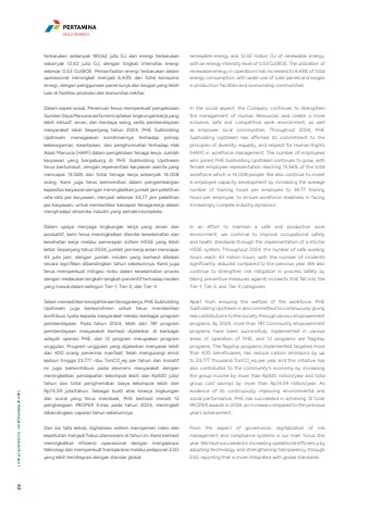 terbarukan sebanyak 180,62 juta GJ dan energi terbarukan sebanyak 12,42 juta GJ, dengan tingkat intensitas energi sebesar 0,53 GJ/BOE. Pemanfaatan energi terbarukan dalam operasional meningkat menjadi 6,43% dari total konsumsi energi, dengan penggunaan panel surya dan biogas yang lebih luas di fasilitas produksi dan komunitas sekitar.Dalam aspek sosial, Perseroan terus memperkuat pengelolaan Sumber Daya Manusia serta menciptakan lingkungan kerja yang lebih inklusif, aman, dan berdaya saing, serta pemberdayaan masyarakat lokal. Sepanjang tahun 2024, PHE Subholding Upstream menegaskan komitmennya terhadap prinsip keberagaman, kesetaraan, dan penghormatan terhadap Hak Asasi Manusia (HAM) dalam pengelolaan tenaga kerja. Jumlah karyawan yang bergabung di PHE Subholding Upstream terus bertumbuh, dengan representasi karyawan wanita yang mencapai 13,56% dari total tenaga kerja sebanyak 14.008 orang. Kami juga terus berinvestasi dalam pengembangan kapasitas karyawan dengan meningkatkan jumlah jam pelatihan rata-rata per karyawan, menjadi sebesar 34,77 jam pelatihan per karyawan, untuk memastikan kesiapan tenaga kerja dalam menghadapi dinamika industri yang semakin kompleks.Dalam upaya menjaga lingkungan kerja yang aman dan produktif, kami terus meningkatkan standar keselamatan dan kesehatan kerja melalui penerapan sistem HSSE yang lebih ketat. Sepanjang tahun 2024, jumlah jam kerja aman mencapai 43 juta jam, dengan jumlah insiden yang berhasil ditekan secara signifikan dibandingkan tahun sebelumnya. Kami juga terus memperkuat mitigasi risiko dalam keselamatan proses dengan melakukan langkah-langkah preventif terhadap insiden yang masuk dalam kategori Tier-1, Tier-2, dan Tier-3.Selain memastikan kesejahteraan tenaga kerja, PHE Subholding Upstream juga berkomitmen untuk terus memberikan kontribusi nyata kepada masyarakat melalui berbagai program pemberdayaan. Pada tahun 2024, lebih dari 781 program pemberdayaan masyarakat berhasil dijalankan di berbagai wilayah operasi PHE, dan 12 program merupakan program unggulan. Program unggulan yang dijalankan menyasar lebih dari 400 orang penerima manfaat, telah mengurangi emisi karbon hingga 23.777 ribu TonCO2eq per tahun dan Inisiatif ini juga berkontribusi pada ekonomi masyarakat dengan meningkatkan pendapatan kelompok lebih dari Rp920 juta/tahun dan total penghematan biaya kelompok lebih dari Rp74,59 juta/tahun. Sebagai bukti atas kinerja lingkungan dan sosial yang terus membaik, PHE berhasil meraih 12 penghargaan PROPER Emas pada tahun 2024, meningkat dibandingkan capaian tahun sebelumnya. Dari sisi tata kelola, digitalisasi sistem manajemen risiko dan kepatuhan menjadi fokus utama kami di tahun ini. Kami berhasil meningkatkan efisiensi operasional dengan mengadopsi teknologi dan memperkuat transparansi melalui pelaporan ESG yang lebih terintegrasi dengan standar global. renewable energy and 12.42 million GJ of renewable energy, with an energy intensity level of 0.53 GJ/BOE. The utilization of renewable energy in operations has increased to 6.43% of total energy consumption, with wider use of solar panels and biogas in production facilities and surrounding communities.In the social aspect, the Company continues to strengthen the management of Human Resources and create a more inclusive, safe and competitive work environment, as well as empower local communities. Throughout 2024, PHE Subholding Upstream has affirmed its commitment to the principles of diversity, equality, and respect for Human Rights (HAM) in workforce management. The number of employees who joined PHE Subholding Upstream continues to grow, with female employee representation reaching 13.56% of the total workforce which is 14,008 people. We also continue to invest in employee capacity development by increasing the average number of training hours per employee to 34.77 training hours per employee, to ensure workforce readiness in facing increasingly complex industry dynamics.In an effort to maintain a safe and productive work environment, we continue to improve occupational safety and health standards through the implementation of a stricter HSSE system. Throughout 2024, the number of safe working hours reach 43 million hours, with the number of incidents significantly reduced compared to the previous year. We also continue to strengthen risk mitigation in process safety by taking preventive measures against incidents that fall into the Tier-1, Tier-2, and Tier-3 categories.Apart from ensuring the welfare of the workforce, PHE Subholding Upstream is also committed to continuously giving real contributions to the society through various empowerment programs. By 2024, more than 781 Community empowerment programs have been successfully implemented in various areas of operation of PHE, and 12 programs are flagship programs. The flagship programs implemented targeted more than 400 beneficiaries, has reduce carbon emissions by up to 23,777 thousand TonCO2eq per year and this initiative has also contributed to the community%u2019s economy by increasing the group income by more than Rp920 million/year and total group cost savings by more than Rp74.59 million/year. As evidence of its continuously improving environmental and social performance, PHE has succeeded in achieving 12 Gold PROPER awards in 2024, an increase compared to the previous year's achievement.From the aspect of governance, digitalization of risk management and compliance systems is our main focus this year. We have succeeded in increasing operational efficiency by adopting technology and strengthening transparency through ESG reporting that is more integrated with global standards. HULU ENERGILaporan Keberlanjutan %u2022 Sustainability Report 42