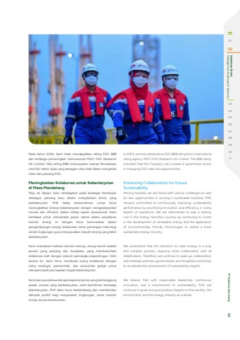 Pada tahun 2024, kami telah mendapatkan rating ESG BBB dari lembaga pemeringkat internasional MSCI ESG Research UK Limited. Nilai rating BBB menunjukkan bahwa Perusahaan memiliki rekam jejak yang beragam atau baik dalam mengelola risiko dan peluang ESG.Meningkatkan Kolaborasi untuk Keberlanjutan di Masa MendatangMaju ke depan, kami dihadapkan pada berbagai tantangan sekaligus peluang baru dalam menjalankan bisnis yang berkelanjutan. PHE tetap berkomitmen untuk terus meningkatkan kinerja keberlanjutan dengan mengedepankan inovasi dan efisiensi dalam setiap aspek operasional. Kami bertekad untuk memainkan peran utama dalam perjalanan transisi energi ini dengan terus berinvestasi dalam pengembangan energi terbarukan serta penerapan teknologi ramah lingkungan guna mewujudkan industri energi yang lebih berkelanjutan.Kami memahami bahwa transisi menuju energi bersih adalah proses yang panjang dan kompleks, yang membutuhkan kolaborasi erat dengan seluruh pemangku kepentingan. Oleh karena itu, kami terus membuka ruang kolaborasi dengan mitra strategis, pemerintah, dan komunitas global untuk mempercepat pencapaian target keberlanjutan.Kami percaya bahwa dengan kepemimpinan yang bertanggung jawab, inovasi yang berkelanjutan, serta komitmen terhadap keberlanjutan, PHE akan terus berkembang dan memberikan dampak positif bagi masyarakat, lingkungan, serta industri energi secara keseluruhan.In 2024, we have obtained an ESG BBB rating from international rating agency MSCI ESG Research UK Limited. The BBB rating indicates that the Company has a mixed or good track record in managing ESG risks and opportunities.Enhancing Collaboration for Future SustainabilityMoving forward, we are faced with various challenges as well as new opportunities in running a sustainable business. PHE remains committed to continuously improving sustainability performance by prioritizing innovation and efficiency in every aspect of operations. We are determined to play a leading role in this energy transition journey by continuing to invest in the development of renewable energy and the application of environmentally friendly technologies to realize a more sustainable energy industry.We understand that the transition to clean energy is a long and complex process, requiring close collaboration with all stakeholders. Therefore, we continue to open up collaboration with strategic partners, governments, and the global community to accelerate the achievement of sustainability targets.We believe that with responsible leadership, continuous innovation, and a commitment to sustainability, PHE will continue to grow and give positive impacts to the society, the environment, and the energy industry as a whole.0102 Message from the Board of Directors Penjelasan Direksi030405060708091011 PT Pertamina Hulu Energi 43