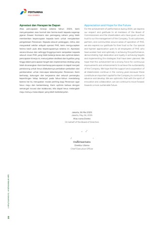 Jakarta, 26 Mei 2025Jakarta, May 26, 2025Atas nama DireksiOn behalf of the Board of DirectorsChalid Said SalimDirektur UtamaChief Executive OfficerApresiasi dan Harapan ke DepanAtas pencapaian kinerja selama tahun 2024, kami menyampaikan rasa hormat dan terima kasih kepada segenap jajaran Dewan Komisaris dan pemegang saham yang telah memberikan kepercayaan kepada kami untuk menjalankan pengelolaan Perseroan. Kepada seluruh pelanggan, mitra, dan masyarakat sekitar wilayah operasi PHE, kami mengucapkan terima kasih pula atas kepercayaannya selama ini. Apresiasi secara khusus dan setinggi-tingginya kami sampaikan kepada seluruh insan PHE yang telah bekerja keras dan optimal dalam pencapaian kinerja ini, menunjukkan dedikasi dan loyalitas yang tinggi dalam pencapaian target dan implementasi strategi yang telah dicanangkan. Kami berharap pencapaian ini dapat menjadi pendorong untuk terus dilakukannya perbaikan-perbaikan dan pembenahan untuk mencapai keberlanjutan Perseroan. Kami berharap, dukungan dan kerjasama dari seluruh pemangku kepentingan tetap berlanjut pada tahun-tahun mendatang karena hal itu merupakan modal penting bagi Perseroan agar terus maju dan berkembang. Kami optimis bahwa dengan semangat inovasi dan kolaborasi, kita dapat terus melangkah maju menuju masa depan yang lebih berkelanjutan.Appreciation and Hope for the FutureFor the achievement of performance during 2024, we express our respect and gratitude to all members of the Board of Commissioners and the shareholders who have given us their trust to run the management of the Company. To all customers, partners, and communities around areas of operation of PHE, we also express our gratitude for their trust so far. Our special and highest appreciation goes to all employees of PHE who have worked hard and optimally in achieving this performance, demonstrating high dedication and loyalty in achieving targets and implementing the strategies that have been planned. We hope that this achievement be a driving force for continuous improvements and enhancements to achieve the sustainability of the Company. We hope that the support and cooperation of all stakeholders continue in the coming years because these constitute an important capital for the Company to continue to advance and develop. We are optimistic that with the spirit of innovation and collaboration, we can continue to move forward towards a more sustainable future.HULU ENERGILaporan Keberlanjutan %u2022 Sustainability Report 44