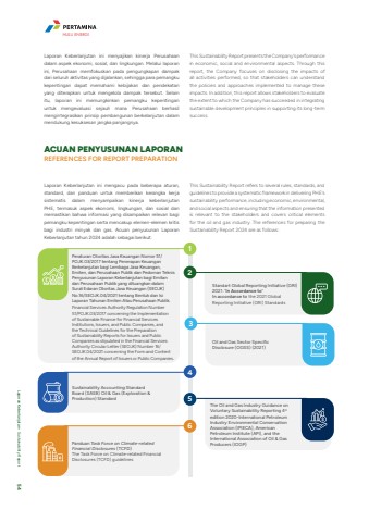 Laporan Keberlanjutan ini menyajikan kinerja Perusahaan dalam aspek ekonomi, sosial, dan lingkungan. Melalui laporan ini, Perusahaan memfokuskan pada pengungkapan dampak dari seluruh aktivitas yang dijalankan, sehingga para pemangku kepentingan dapat memahami kebijakan dan pendekatan yang diterapkan untuk mengelola dampak tersebut. Selain itu, laporan ini memungkinkan pemangku kepentingan untuk mengevaluasi sejauh mana Perusahaan berhasil mengintegrasikan prinsip pembangunan berkelanjutan dalam mendukung kesuksesan jangka panjangnya.This Sustainability Report presents the Company's performance in economic, social and environmental aspects. Through this report, the Company focuses on disclosing the impacts of all activities performed, so that stakeholders can understand the policies and approaches implemented to manage these impacts. In addition, this report allows stakeholders to evaluate the extent to which the Company has succeeded in integrating sustainable development principles in supporting its long-term success.Peraturan Otoritas Jasa Keuangan Nomor 51/POJK.03/2017 tentang Penerapan Keuangan Berkelanjutan bagi Lembaga Jasa Keuangan, Emiten, dan Perusahaan Publik dan Pedoman Teknis Penyusunan Laporan Keberlanjutan bagi Emitan dan Perusahaan Publik yang dituangkan dalam Surat Edaran Otoritas Jasa Keuangan (SEOJK) No.16/SEOJK.04/2021 tentang Bentuk dan Isi Laporan Tahunan Emiten Atau Perusahaan Publik.Financial Services Authority Regulation Number 51/POJK.03/2017 concerning the Implementation of Sustainable Finance for Financial Services Institutions, Issuers, and Public Companies, and the Technical Guidelines for the Preparation of Sustainability Reports for Issuers and Public Companies as stipulated in the Financial Services Authority Circular Letter (SEOJK) Number 16/SEOJK.04/2021 concerning the Form and Content of the Annual Report of Issuers or Public Companies.23 456Standart Global Reporting Initiative (GRI) 2021: %u2018In Accordance to%u2019In accordance to the 2021 Global Reporting Initiative (GRI) StandardsSustainability Accounting Standard Board (SASB) Oil & Gas (Exploration & Production) StandardOil and Gas Sector Specific Disclosure (OGSS) (2021)The Oil and Gas Industry Guidance on Voluntary Sustainability Reporting 4thedition 2020-International Petroleum Industry Environmental Conservation Association (IPIECA), American Petroleum Institute (API), and the International Association of Oil & Gas Producers (IOGP) Laporan Keberlanjutan ini mengacu pada beberapa aturan, standard, dan panduan untuk memberikan kerangka kerja sistematis dalam menyampaikan kinerja keberlanjutan PHE, termasuk aspek ekonomi, lingkungan, dan sosial dan memastikan bahwa informasi yang disampaikan relevan bagi pemangku kepentingan serta mencakup elemen-elemen kritis bagi industri minyak dan gas. Acuan penyusunan Laporan Keberlanjutan tahun 2024 adalah sebagai berikut:This Sustainability Report refers to several rules, standards, and guidelines to provide a systematic framework in delivering PHE's sustainability performance, including economic, environmental, and social aspects and ensuring that the information presented is relevant to the stakeholders and covers critical elements for the oil and gas industry. The references for preparing the Sustainability Report 2024 are as follows:ACUAN PENYUSUNAN LAPORANREFERENCES FOR REPORT PREPARATION1Panduan Task Force on Climate-related Financial Disclosures (TCFD)The Task Force on Climate-related Financial Disclosures (TCFD) guidelinesHULU ENERGILaporan Keberlanjutan %u2022 Sustainability Report 54