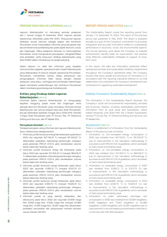 PERIODE DAN SIKLUS LAPORAN [GRI 2-3]Laporan Keberlanjutan ini mencakup periode pelaporan dari 1 Januari hingga 31 Desember 2024. Laporan periode sebelumnya diterbitkan pada Mei 2024. Penyusunan laporan dilakukan secara tahunan sebagai bagian dari komitmen Perusahaan untuk menyediakan informasi yang transparan dan akurat terkait kinerja keberlanjutan pada aspek ekonomi, sosial, dan lingkungan. Siklus pelaporan tahunan ini memungkinkan Perusahaan untuk mengevaluasi pencapaian, mengidentifikasi area perbaikan, serta menyusun strategi keberlanjutan yang lebih efektif dalam mendukung visi jangka panjang.Dalam laporan ini, data dan informasi yang disajikan mencerminkan kegiatan operasional dan inisiatif keberlanjutan yang dilaksanakan di seluruh wilayah operasional Perusahaan. Perusahaan memastikan bahwa setiap pembaruan dan pengungkapan informasi telah sesuai dengan standar pelaporan yang diacu, sehingga para pemangku kepentingan dapat memahami perkembangan dan kontribusi Perusahaan dalam mendukung pembangunan berkelanjutan.Entitas yang Dicakup dalam Laporan Keberlanjutan [GRI 2-2]Informasi dalam Laporan Keberlanjutan ini mengungkap kegiatan tanggung jawab sosial dan lingkungan serta dampak ekonomi Perseroan yang mencakup informasi kinerja keberlanjutan dari semua wilayah kerja dan Anak Perusahaan, kecuali disebutkan berbeda. Hingga tahun 2024 PHE memiliki 3 (tiga) Anak Perusahaan yaitu PT Elnusa Tbk., PT Pertamina Drilling and Services, dan PT Badak NGL. Pernyataan Kembali [GRI 2-4]Terdapat penyajian ulang informasi dari Laporan Keberlanjutan tahun sebelumnya sebagai berikut: 1. Informasi jumlah konsumsi energi tak terbarukan pada tahun 2022 dari sejumlah 167.742,51 TJ menjadi 197.333,07 TJdikarenakan perbaikan metodologi perhitungan mengacupada pedoman IPIECA CCE-6 yaitu berdasarkan volumebahan bakar dan heating value.2. Informasi jumlah konsumsi energi tak terbarukan padatahun 2023 dari sejumlah 157.355,15 TJ menjadi 189.216,17TJ dikarenakan perbaikan metodologi perhitungan mengacu pada pedoman IPIECA CCE-6 yaitu berdasarkan volumebahan bakar dan heating value.3. Informasi jumlah konsumsi energi terbarukan pada tahun2022 dari sejumlah 4.590,12 TJ menjadi 9.215,75 GJdikarenakan perbaikan metodologi perhitungan mengacupada pedoman IPIECA CCE-6 yaitu berdasarkan volumebahan bakar dan heating value.4. Informasi jumlah konsumsi energi terbarukan pada tahun2023 dari sejumlah 6.393,70 TJ menjadi 10.620,31 GJdikarenakan perbaikan metodologi perhitungan mengacupada pedoman IPIECA CCE-6 yaitu berdasarkan volumebahan bakar dan heating value.5. Informasi jumlah air yang diambil, dilepaskan, dandikonsumsi pada tahun 2022 dari sejumlah 25.929 megaliter; 8.283 mega liter; 17.645 mega liter menjadi 24.585mega liter; 12.293 mega liter; 12,293 mega liter dikarenakanperbaikan pencatatan dan penyesuaian metode estimasisesuai standar GRI 303.REPORT PERIOD AND CYCLE [GRI 2-3]This Sustainability Report covers the reporting period from January 1 to December 31, 2024. The report of the previous period was published in May 2024. The report is prepared annually as a part of the Company's commitment to providing transparent and accurate information related to sustainability performance in economic, social, and environmental aspects. This annual reporting cycle allows the Company to evaluate achievements, identify areas for improvement, and develop more effective sustainability strategies to support its longterm vision.In this report, the data and information presented reflect operational activities and sustainability initiatives implemented throughout the Company's operational areas. The Company ensures that every update and disclosure of information is in accordance with the reporting standards referred to, so that stakeholders can understand the Company's development and contribution to supporting sustainable development.Entities Covered in Sustainability Report [GRI 2-2]The information in this Sustainability Report discloses the Company's social and environmental responsibility activities and economic impacts, including sustainability performance information from all work areas and Subsidiaries, unless stated otherwise. Until 2024 PHE has 3 (three) Subsidiaries, namely PT Elnusa Tbk., PT Pertamina Drilling and Services, and PT Badak NGL. Restatement [GRI 2-4]There is a restatement of information from the Sustainability Report of the previous year as follows:1. Information on non-renewable energy consumption in2022 was restated from 167,742.51 TJ to 197,333.07 TJdue to improvements in the calculation methodology inaccordance with IPIECA CCE-6 guidelines, which are based on fuel volume and heating value.2. Information on non-renewable energy consumption in2023 was restated from 157,355.15 TJ to 189,216.17 TJdue to improvements in the calculation methodology inaccordance with IPIECA CCE-6 guidelines, which are based on fuel volume and heating value.3. Information on renewable energy consumption in 2022was restated from 4,590.12 TJ to 9,215.75 GJ dueto improvements in the calculation methodology inaccordance with IPIECA CCE-6 guidelines, which are based on fuel volume and heating value.4. Information on renewable energy consumption in 2023was restated from 6,393.70 TJ to 10,620.31 GJ dueto improvements in the calculation methodology inaccordance with IPIECA CCE-6 guidelines, which are based on fuel volume and heating value.5. Information on water withdrawal, discharge, andconsumption in 2022 was restated from 25,929 megaliters;8,283 megaliters; and 17,645 megaliters to 24,585megaliters; 12,293 megaliters; and 12,293 megaliters due toimprovements in record-keeping and estimation methods in conformity with GRI 303 standards.HULU ENERGILaporan Keberlanjutan %u2022 Sustainability Report 56