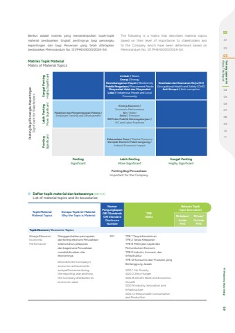 Berikut adalah matriks yang mendeskripsikan topik-topik material berdasarkan tingkat pentingnya bagi pemangku kepentingan dan bagi Perseroan yang telah ditetapkan berdasarkan Memorandum No. 121/PHE43000/2024-S4: The following is a matrix that describes material topics based on their level of importance to stakeholders and to the Company which have been determined based on Memorandum No. 121/PHE43000/2024-S4:Sangat Penting Highly SignificantLimbah / WasteEnergi / EnergyKeanekaragaman Hayati / BiodiversityPraktik Pengadaan / Procurement PracticMasyarakat Adat dan Masyarakat Lokal / Indigenous People and Local CommunityKesehatan dan Keamanan Kerja (K3)Occupational Health and Safety (OHS)Anti Korupsi / Anti-corruptionLebih Penting More SignificantPelatihan dan Pengembangan Pekerja /Employee Training and DevelopmentKinerja Ekonomi /Economic PerformanceAir / WaterEmisi / EmissionSDM dan Praktik Ketenagakerjaan /HC and Labor PracticesPenting SignificantKeberadaan Pasar / Market PresenceDampak Ekonomi Tidak Langsung /Indirect Economic ImpactPentingSignificantLebih PentingMore SignificantSangat PentingHighly SignificantPenting Bagi Pemangku Kepentingan Significant for StakeholdersPenting Bagi PerusahaanImportant for the CompanyMatriks Topik MaterialMatrix of Material TopicsTopik MaterialMaterial TopicsKenapa Topik Ini MaterialWhy the Topic is MaterialNomor PengungkapanGRI StandardsGRI Standard Disclosure NumberTPBSDGsBatasan TopikTopic BoundariesDi dalam/ InsidePHEDi luar/OutsidePHETopik Ekonomi / Economic TopicsKinerja EkonomiEconomic PerformanceMenggambarkan pencapaian dan kinerja ekonomi Perusahaan selama tahun pelaporan dan bagaimana Perusahaan mendistribusikan nilai ekonominyaDescribes the Company's economic achievements and performance during the reporting year and how the Company distributes its economic value201 TPB 1 Tanpa KemiskinanTPB 2 Tanpa KelaparanTPB 8 Pekerjaan Layak dan Pertumbuhan EkonomiTPB 9 Industri, Innovasi, dan InfrastrukturTPB 12 Konsumsi dan Produksi yang Bertanggung JawabSDG 1 No PovertySDG 2 Zero HungerSDG 8 Decent Work and Economic GrowthSDG 9 Industry, Innovation and InfrastructureSDG 12 Responsible Consumption and ProductionDaftar topik material dan batasannya [GRI 3-2]List of material topics and its boundaries010203 About This Report Tentang Laporan Ini0405060708091011 PT Pertamina Hulu Energi 59