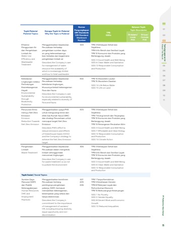 Topik MaterialMaterial TopicsKenapa Topik Ini MaterialWhy the Topic is MaterialNomor PengungkapanGRI StandardsGRI Standard Disclosure NumberTPBSDGsBatasan TopikTopic BoundariesDi dalam/ InsidePHEDi luar/OutsidePHEEfisiensi Penggunaan Air dan Pengelolaan Limbah AirWater Use Efficiency and Wastewater TreatmentMenggambarkan kepedulian Perusahaan terhadap pengelolaan sumber daya air yang ketersediaannya kian terbatas dan bagaimana pengelolaan limbah airDescribes the Company's care for management of water resource the availability of which is increasingly limited and how to treat wastewater303 TPB 3 Kehidupan Sehat dan SejahteraTPB 6 Air Bersih dan Sanitasi LayakTPB 12 Konsumsi dan Produksi yang Bertanggung JawabSDG 3 Good Health and Well-BeingSDG 6 Clean Water and SanitationSDG 12 Responsible Consumption and ProductionKelestarian Lingkungan melalui Perlindungan Keanekaragaman HayatiEnvironmental Sustainability through Biodiversity ProtectionMenggambarkan kepedulian Perusahaan terhadap kelestarian lingkungan, khususnya terkait keberagaman flora dan faunaDescribes the Company's care for environmental sustainability, especially related to diversity of flora and fauna304 TPB 14 Ekosistem LautanTPB 15 Ekosistem DaratanSDG 14 Life Below WaterSDG 15 Life on LandPenurunan Emisi menuju Net Zero EmissionEmission Reduction Towards Net Zero EmissionMenggambarkan upaya PHE untuk mengurangi emisi dan efek Gas Rumah Kaca (GRK) dan strategi Perusahaan untuk mencapai target Net Zero EmissionDescribes PHE%u2019s effort to reduce emissions and effects of Greenhouse Gases (GHG) and the Company's strategy to achieve the Net Zero Emission target305 TPB 3 Kehidupan Sehat dan SejahteraTPB 7 Energi bersih dan TerjangkauTPB 12 Konsumsi dan Produksi yang Bertanggung JawabTPB 13 Penanganan Perubahan IklimSDG 3 Good Health and Well-BeingSDG 7 Affordable and Clean EnergySDG 12 Responsible Consumption and ProductionSDG 13 Climate ActionPengelolaan LimbahWaste TreatmentMenggambarkan kepedulian Perusahaan dalam mengelola limbah sehingga tidak mencemari lingkungan Describes the Company's care for waste treatment so as not to pollute the environment306 TPB 3 Kehidupan Sehat dan SejahteraTPB 6 Air Bersih dan Sanitasi LayakTPB 12 Konsumsi dan Produksi yang Bertanggung JawabSDG 3 Good Health and Well-BeingSDG 6 Clean Water and SanitationSDG 12 Responsible Consumption and ProductionTopik Sosial / Social TopicsSumber Daya Manusia (SDM) dan Praktik KetenagakerjaanHuman Resources (HR) and Employment PracticesMenggambarkan komitmen Perusahaan tentang pentingnya pengelolaan pekerja /SDM, termasuk memastikan keberagaman, kesempatan yang setara dan tanpa diskriminasiDescribes the Company's commitment to the importance of management of workers/HR, including ensuring diversity, equal opportunity and nondiscrimination401 405 406TPB 1 Tanpa KemiskinanTPB 5 Kesetaraan GenderTPB 8 Pekerjaan Layak dan Pertumbuhan EkonomiTPB 10 Berkurangnya KesenjanganSDG 1 No PovertySDG 5 Gender EqualitySDG 8 Decent Work and Economic GrowthSDG 10 Reduced Inequalities010203 About This Report Tentang Laporan Ini0405060708091011 PT Pertamina Hulu Energi 61