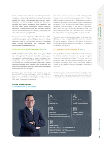 Proses pemilihan assurer dilakukan secara transparan melalui mekanisme tender yang melibatkan persetujuan Direksi dan diwakili oleh Komite Keberlanjutan. Dalam memilih assurer, Perusahaan mempertimbangkan kualitas dan kompetensi penyedia jasa, seperti pengalaman kerja, kapabilitas, dan sertifikasi dalam bidang Sustainability Report Assurance. Perusahaan juga memastikan tidak ada hubungan kerja lain dengan assurance eksternal untuk menjaga independensi dan objektivitas assurance yang diberikan.Laporan dari assurer independen untuk tahun buku 2024 dapat ditemukan pada halaman 334 pada laporan ini. Adanya assurance eksternal mencerminkan komitmen Perusahaan dalam menjaga akuntabilitas dan transparansi dalam menyampaikan kinerja keberlanjutan.AKSESIBILITAS DAN UMPAN BALIK [GRI 2-3]Untuk mendukung terwujudnya komunikasi yang efektif dan memungkinkan Perusahaan melakukan evaluasi guna meningkatkan kualitas Laporan di masa mendatang, kami menyertakan Lembar Umpan Balik di bagian akhir dokumen ini. Melalui lembar tersebut, pembaca dan pengguna laporan dapat menyampaikan saran, masukan, opini, serta umpan balik lainnya yang akan sangat membantu dalam upaya peningkatan kualitas pelaporan di masa depan.Perusahaan juga menyediakan akses informasi yang luas kepada seluruh pemangku kepentingan, termasuk investor dan pihak lainnya, terkait laporan keberlanjutan ini. Untuk informasi lebih lanjut, Anda dapat menghubungi:The assurer selection process is carried out transparently through a tender mechanism involving approval from the Board of Directors and represented by the Sustainability Committee. In selecting an assurer, the Company considers the quality and competence of the service provider, such as work experience, capabilities, and certification in the field of Sustainability Report Assurance. The Company also ensures that there is no other working relationship with external assurance to maintain the independence and objectivity of the assurance provided.The report from the independent assurer for financial year 2024 can be found on page 334 of this report. The existence of external assurance reflects the Company's commitment to maintaining accountability and transparency in delivering sustainability performance.ACCESSIBILITY AND FEEDBACK [GRI 2-3]To support effective communication and enable the Company to conduct evaluations to improve the quality of Reports in the future, we include a Feedback Form at the end of this document. Using this form, readers and users of the report can submit suggestions, input, opinions, and other feedback that will be very helpful in improving the quality of reporting in the future.The Company also provides all stakeholders, including investors and other parties, with broad access to information about this sustainability report. For further information, you can contact:Nama / NameMuhammad Lisanulhaq RoyJabatan / PositionManager Investor RelationsInvestor Relations ManagerAlamat / AddressPHE Tower, Lantai 10, Jl. TB Simatupang Kav.99 Jakarta Selatan 12520-IndonesiaPHE Tower, 10th Floor, Jl. TB Simatupang Kav.99, South Jakarta 12520-IndonesiaTelepon / Telephone+62 21 2954 7000Surel / Emailmuhammad.roy@pertamina.cominvestorrelation.phe@pertamina.comKontak Terkait LaporanContact Related to the Report010203 About This Report Tentang Laporan Ini0405060708091011 PT Pertamina Hulu Energi 63