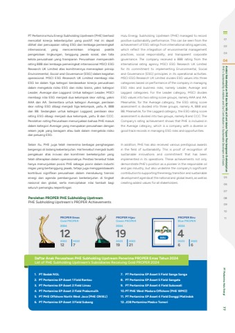 Perolehan PROPER PHE Subholding UpstreamPHE Subholding Upstream's PROPER AchievementsPROPER EmasGold PROPER2024122023 202212 7PROPER HijauGreen PROPER2024192023 202219 21PROPER BiruBlue PROPER202442023 20226 6Daftar Anak Perusahaan PHE Subholding Upstream Penerima PROPER Emas Tahun 2024List of PHE Subholding Upstream's Subsidiaries Receiving Gold PROPER 2024BIRU1. PT Badak NGL2. PT Pertamina EP Asset 1 Field Rantau3. PT Pertamina EP Asset 2 Field Limau4. PT Pertamina EP Asset 2 Field Prabumulih5. PT PHE Offshore North West Java (PHE ONWJ)6. PT Pertamina EP Asset 3 Field Subang7. PT Pertamina EP Asset 5 Field Sanga Sanga8. PT Pertamina EP Asset 5 Field Sangata9. PT Pertamina EP Asset 4 Field Sukowati10.PT PHE West Madura Offshore (PHE WMO)11. PT Pertamina EP Asset 4 Field Donggi Matindok12. JOB Pertamina Medco TomoriPT Pertamina Hulu Energi Subholding Upstream (PHE) berhasil mencatat kinerja keberlanjutan yang positif. Hal ini dapat dilihat dari pencapaian rating ESG dari lembaga pemeringkat internasional, yang mencerminkan integrasi praktik pengelolaan lingkungan, tanggung jawab sosial, dan tata kelola perusahaan yang transparan. Perusahaan memperoleh rating BBB dari lembaga pemeringkat internasional MSCI ESG Research UK Limited atas komitmennya menerapkan prinsip Environmental, Social and Governance (ESG) dalam kegiatan operasional. MSCI ESG Research UK Limited membagi nilai ESG ke dalam tiga kategori berdasarkan kinerja perusahaan dalam mengelola risiko ESG dan risiko bisnis, yakni kategori Leader, Average dan Laggard. Untuk kategori Leader, MSCI membagi nilai ESG menjadi dua kelompok skor rating, yakni AAA dan AA. Sementara untuk kategori Average, penilaian skor rating ESG dibagi menjadi tiga kelompok, yaitu A, BBB dan BB. Sedangkan untuk kategori Laggard, penilaian skor rating ESG dibagi menjadi dua kelompok, yaitu B dan CCC. Perolehan rating Perusahaan menunjukkan bahwa PHE masuk dalam kategori Average yang merupakan perusahaan dengan rekam jejak yang beragam atau baik dalam mengelola risiko dan peluang ESG.Selain itu, PHE juga telah menerima berbagai penghargaan bergengsi di bidang keberlanjutan. Hal tersebut menjadi bukti pengakuan atas inovasi dan komitmen berkelanjutan yang telah diterapkan dalam operasionalnya. Prestasi tersebut tidak hanya menunjukkan posisi PHE sebagai pionir dalam industri migas yang bertanggung jawab, tetapi juga menggarisbawahi kontribusi signifikan perusahaan dalam mendukung transisi energi dan agenda pembangunan berkelanjutan di tingkat nasional dan global, serta menciptakan nilai tambah bagi seluruh pemangku kepentingan.Hulu Energy Subholding Upstream (PHE) managed to record positive sustainability performance. This can be seen from the achievement of ESG ratings from international rating agencies, which reflect the integration of environmental management practices, social responsibility, and transparent corporate governance. The company received a BBB rating from the international rating agency MSCI ESG Research UK Limited for its commitment to implementing Environmental, Social and Governance (ESG) principles in its operational activities. MSCI ESG Research UK Limited divides ESG values into three categories based on performance of the company in managing ESG risks and business risks, namely Leader, Average and Laggard categories. For the Leader category, MSCI divides ESG values into two rating score groups, namely AAA and AA. Meanwhile, for the Average category, the ESG rating score assessment is divided into three groups, namely A, BBB and BB. Meanwhile, for the Laggard category, the ESG rating score assessment is divided into two groups, namely B and CCC. The Company's rating achievement shows that PHE is included in the Average category, which is a company with a diverse or good track records in managing ESG risks and opportunities.In addition, PHE has also received various prestigious awards in the field of sustainability. This is proof of recognition of sustainable innovations and commitment that has been implemented in its operations. These achievements not only demonstrate PHE's position as a pioneer in the responsible oil and gas industry, but also underline the company's significant contribution to supporting the energy transition and sustainable development agenda at the national and global levels, as well as creating added values for all stakeholders.01020304PHE's Sustainability Ambition and Our Contribution to Sustainable Development Goals Ambisi Keberlanjutan PHE dan Kontribusi Kami dalam Tujuan Pembangunan Berkelanjutan05060708091011 PT Pertamina Hulu Energi 77