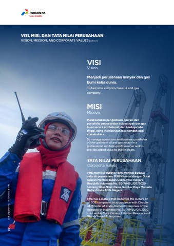 Menjadi perusahaan minyak dan gas bumi kelas dunia.To become a world-class oil and gas company.VISIVisionMISIMissionMelaksanakan pengelolaan operasi dan portofolio usaha sektor hulu minyak dan gas bumi secara profesional, dan berdaya laba tinggi, serta memberikan nilai tambah bagistakeholders.To manage operations and business portfolios of the upstream oil and gas sector in a professional and high-profit manner and to provide added value to stakeholders.TATA NILAI PERUSAHAANCorporate ValuesPHE memiliki budaya yang menjadi budaya seluruh perusahaan BUMN sesuai dengan Surat Edaran Menteri Badan Usaha Milik Negara Republik Indonesia No. SE-7/MBU/07/2020 tentang Nilai-Nilai Utama Sumber Daya Manusia Badan Usaha Milik Negara.PHE has a culture that becomes the culture of all SOE companies in accordance with Circular of Minister of State-Owned Enterprises of the Republic of Indonesia No. SE-7/MBU/07/2020 concerning Core Values of Human Resources of State-Owned Enterprises.HULU ENERGIVISI, MISI, DAN TATA NILAI PERUSAHAANVISION, MISSION, AND CORPORATE VALUES [OJK C.1]Laporan Keberlanjutan %u2022 Sustainability Report 84HULU ENERGI