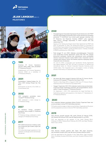 JEJAK LANGKAH[GRI 2-1]MILESTONESPHE melakukan tahapan penetapan bilahan Struktur Organisasi Dasar dan proses persiapan menuju PHE Subholding Upstream.PHE performed the stages of determining the Basic Organizational Structure and the preparation process to become PHE Subholding Upstream.2020PHE ditunjuk menjadi operator WK Jambi Merang (9 Februari 2019), WK Maratua (28 Februari 2019), dan WK Raja/Pendopo (5 Juli 2019).PHE was appointed as the operator of the Jambi Merang Block (February 9, 2019), Maratua Block (February 28, 2019), and Raja/ Pendopo Block (July 5, 2019).2019PHE ditunjuk menjadi operator WK Tuban, WK Ogan Komering, WK Southeast Sumatra (SES), dan WK North Sumatra Offshore (NSO).PHE was appointed as the operator of the Tuban Block, Ogan Komering Block, Southeast Sumatra (SES) Block, and North Sumatra Offshore (NSO) Block.2018PT Pertahulu Energy mengalami perubahan nama menjadi PT Pertamina Hulu Energi.PT Pertahulu Energy underwent a name change to PT Pertamina Hulu Energi.2007Pendirian PT Aroma Operations Services (AOS) selaku anak perusahaan PT Pertamina (Persero).Establishment of PT Aroma Operations Services (AOS) as a subsidiary of PT Pertamina (Persero).1989Pemberlakuan Undang-Undang No. 22 Tahun 2001 tentang Minyak dan Gas Bumi.Enforcement of Law No. 22 of 2001 on Oil and Natural Gas.2001 %u2022 Alih kelola WK Rokan tanggal 9 Agustus 2021 dari PT Chevron Pacific Indonesia (CPI) kepada PT Pertamina Hulu Rokan (PHR).Transfer of the Rokan WK on August 9, 2021 from PT Chevron Pacific Indonesia (CPI) to PT Pertamina Hulu Rokan (PHR).%u2022 Tanggal 1 September 2021, PHE melakukan implementasi pembentukan (Legal End-State) Subholding Upstream dan pengambilalihan seluruh saham 11 Anak Perusahaan PT Pertamina (Persero).On September 1, 2021, PHE implemented the Legal End-State for Subholding Upstream and acquisition of all shares of 11 Subsidiaries of PT Pertamina (Persero).2021PHE efektif beroperasi di bidang usaha hulu minyak dan gas di dalam negeri dan luar negeri.PHE effectively began operations in the upstream oil and gas sector domestically and abroad.2017AOS mengalami perubahan nama menjadi PT Pertahulu Energy.AOS underwent a name change to PT Pertahulu Energy.2002%u2022 Penandatanganan Asset Sales Agreement Proyek Tambourine oleh PIREP dan EMIL pada tanggal 31 Desember 2022. Proyek Tambourine merupakan pembelian PI ExxonMobil Iraq Limited pada lapangan eksisting milik PT Pertamina Irak Eksplorasi Produksi (%u201cPIREP%u201d) yaitu Lapangan West Qurna-1 sehingga kepemilikan PI PIREP menjadi 20% dari sebelumnya 10%.Signing of the Tambourine Project Asset Sales Agreement by PIREP and EMIL on December 31, 2022. The Tambourine project is a purchase of PI ExxonMobil Iraq Limited in the existing field owned by PT Pertamina Iraq Eksplorasi Ekspor (%u201cPIREP%u201d), namely the West Qurna-1, thereby increasing PI PIREP%u2019s ownership from 10% to 20%.%u2022 Pada tanggal 10 Juni 2022, dilakukan penandatanganan %u201cCorporate Loan Syndication Facility Agreement%u201d antara PHE, PEP, PHI, dengan konsorsium perbankan nasional dan internasional untuk pembiayaan General Corporate Purposes senilai USD2,5 miliar. Corporate Loan ini menjadi yang terbesar secara nilai fasilitas pinjaman sepanjang sejarah Corporate Loan di Indonesia.On June 10, 2022, a Corporate Loan Syndication Facility Agreement was signed between PHE, PEP, PHI and a consortium of national and international banks for General Corporate Purposes financing worth USD2.5 billion. This Corporate Loan is the largest in terms of facility amount in the history of Corporate Loans in Indonesia.2022HULU ENERGILaporan Keberlanjutan %u2022 Sustainability Report 86